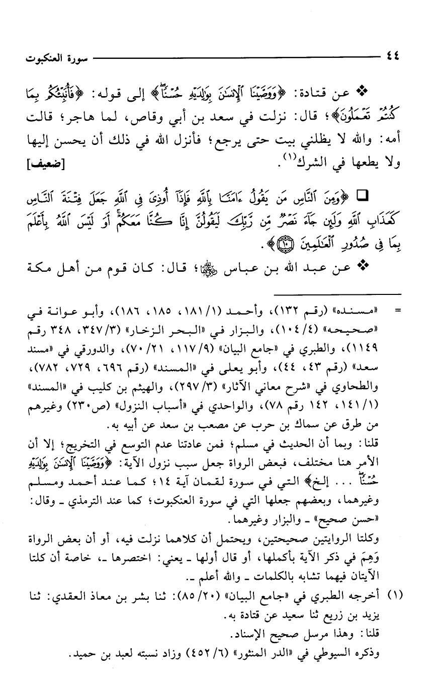 قلنا: وبما أن الحديث في مسلم؛ فمن عادتنا عدم التوسع في التخريج؛ إلا أن الأمر هنا مختلف، فبعض الرواة جعل سبب نزول الآية: {وَوَصَّيْنَا الْإِنْسَانَ بِوَالِدَيْهِ حُسْنًا. . . إلخ} التي في سورة لقمان آية 14؛ كما عند أحمد ومسلم وغيرهما، وبعضهم جعلها التي في سورة العنكبوت؛ كما عند الترمذي -وقال: "حسن صحيح"- والبزار وغيرهما.