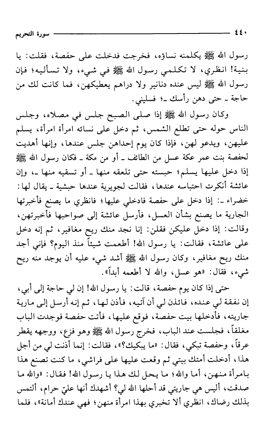 وكان رسول الله - صلى الله عليه وسلم - إذا صلى الصبح جلس في مصلاه، وجلس الناس حوله حتى تطلع الشمس، ثم دخل على نسائه امرأة امرأة، يسلم عليهن، ويدعو لهن، فإذا كان يوم إحداهن جلس عندها، وإنها أهديت لحفصة بنت عمر عكة عسل من الطائف -أو من مكة- فكان رسول الله - صلى الله عليه وسلم - إذا دخل عليها يسلم؛ حبسته حتى تلعقه منها -أو تسقيه منها-، وإن عائشة أنكرت احتباسه عندها، فقالت لجويرية عندها حبشية -يقال لها: خضراء-: إذا دخل على حفصة فادخلي عليها؛ فانظري ما يصنع فأخبرتها الجارية ما يصنع بشأن العسل، فأرسل عائشة إلى صواحبها فأخبرتهن، وقالت: إذا دخل عليكن فقلن: إنا نجد منك ريح مغافير، ثم إنه دخل على عائشة، فقالت: يا رسول الله! أطعمت شيئاً منذ اليوم؟ فإني أجد منك ريح مغافير، وكان رسول الله - صلى الله عليه وسلم - أشد شيء عليه أن يوجد منه ريح شيء، فقال: "هو عسل، والله لا أطعمه أبداً".
