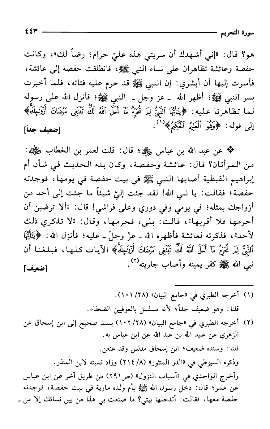 * عن عبد الله بن عباس -رضي الله عنهما-؛ قال: قلت لعمر بن الخطاب -رضي الله عنه-: من المرأتان؟ قال: عائشة وحفصة، وكان بدء الحديث في شأن أم إبراهيم القبطية أصابها النبي - صلى الله عليه وسلم - في بيت حفصة في يومها، فوجدته حفصة؛ فقالت: يا نبي الله! لقد جئت إليَّ شيئاً ما جئت إلى أحد من أزواجك بمثله؛ في يومي وفي دوري وعلى فراشي! قال: "ألا ترضين أن أحرمها فلا أقربها"، قالت: بلى، فحرمها، وقال: "لا تذكري ذلك لأحد"، فذكرته لعائشة فأظهره الله -عزّ وجلّ- عليه؛ فأنزل الله: {يَاأَيُّهَا النَّبِيُّ لِمَ تُحَرِّمُ مَا أَحَلَّ الله لَكَ تَبْتَغِي مَرْضَاتَ أَزْوَاجِكَ} الآيات كلها، فبلغنا أن نبي الله - صلى الله عليه وسلم - كفر يمينه وأصاب جاريته (¬2). [ضعيف]