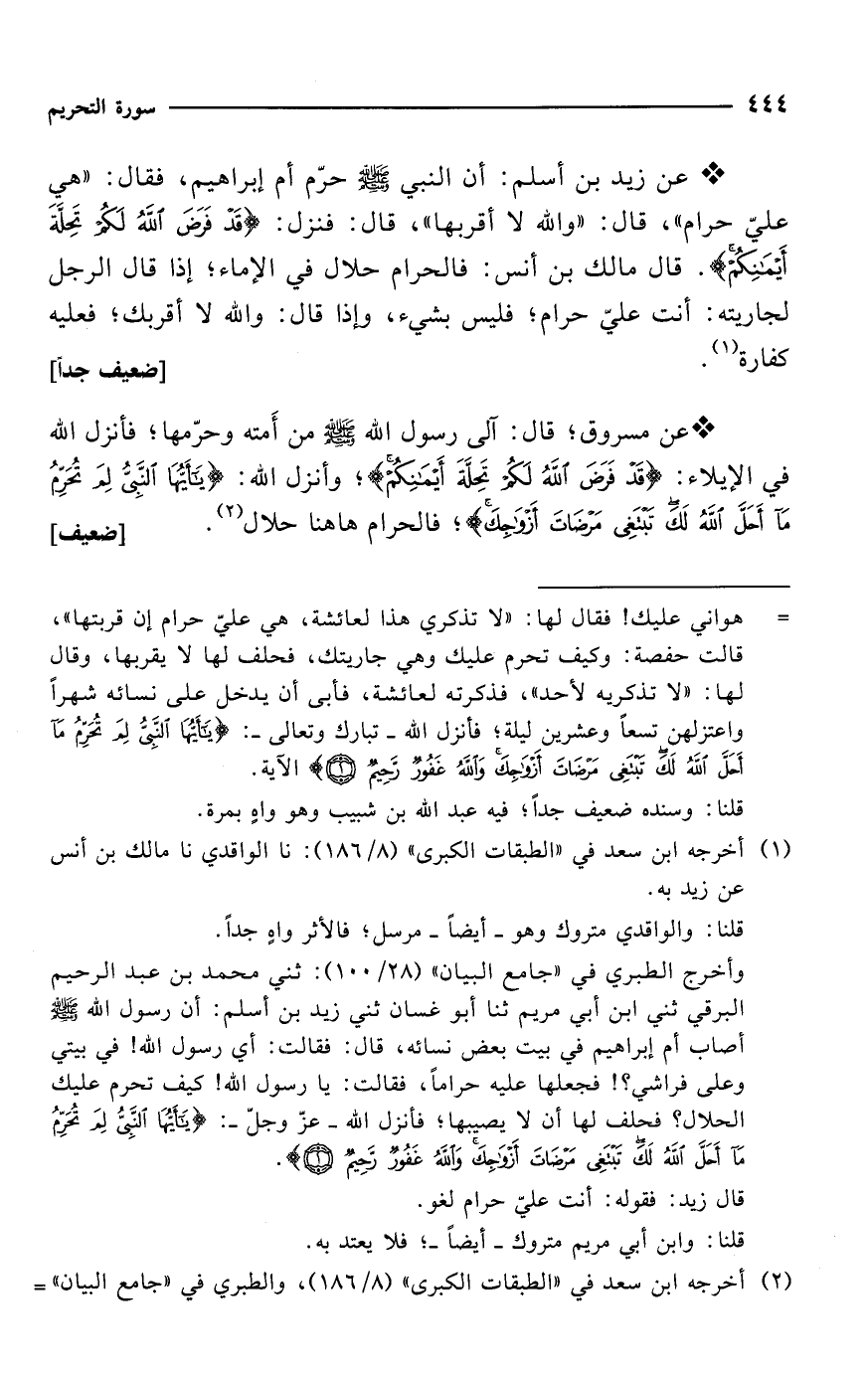 وأخرج الطبري في "جامع البيان" (28/ 100): ثني محمد بن عبد الرحيم البرقي ثني ابن أبي مريم ثنا أبو غسان ثني زيد بن أسلم: أن رسول الله - صلى الله عليه وسلم - أصاب أم إبراهيم في بيت بعض نسائه، قال: فقالت: أي رسول الله! في بيتي وعلى فراشى؟! فجعلها عليه حراماً، فقالت: يا رسول الله! كيف تحرم عليك الحلال؟ فحلف لها أن لا يصيبها، فأنزل الله -عزّ وجلّ-: {يَاأَيُّهَا النَّبِيُّ لِمَ تُحَرِّمُ مَا أَحَلَّ الله لَكَ تَبْتَغِي مَرْضَاتَ أَزْوَاجِكَ وَاللهُ غَفُورٌ رَحِيمٌ (1)}.