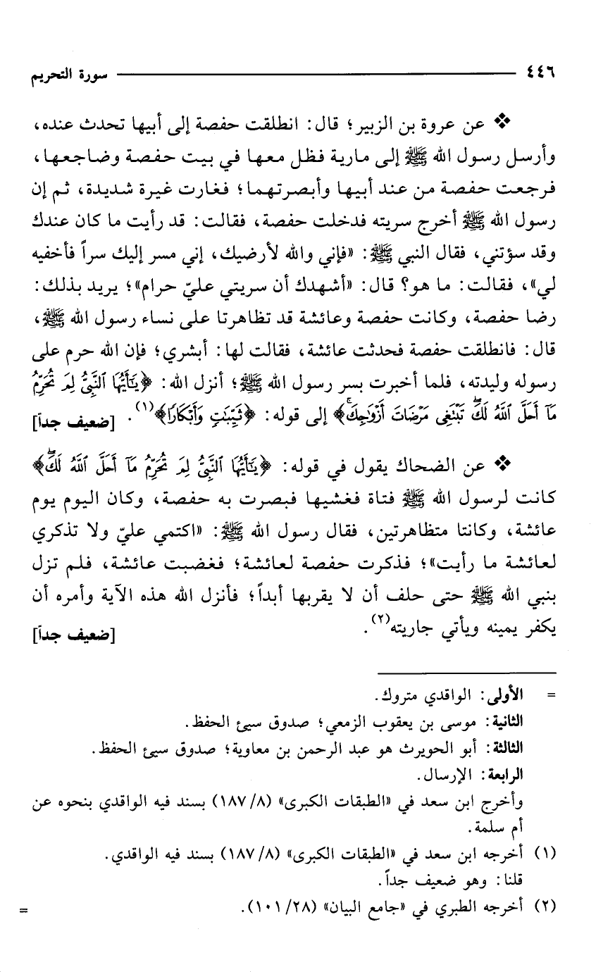 * عن عروة بن الزبير؛ قال: انطلقت حفصة إلى أبيها تحدث عنده، وأرسل رسول الله - صلى الله عليه وسلم - إلى مارية فظل معها في بيت حفصة وضاجعها، فرجعت حفصة من عند أبيها وأبصرتهما؛ فغارت غيرة شديدة، ثم إن رسول الله - صلى الله عليه وسلم - أخرج سريته فدخلت حفصة، فقالت: قد رأيت ما كان عندك وقد سؤتني، فقال النبي - صلى الله عليه وسلم -: "فإني والله لأرضيك، إني مسر إليك سراً فأخفيه لي"، فقالت: ما هو؟ قال: "أشهدك أن سريتي عليّ حرام"؛ يريد بذلك: رضا حفصة، وكانت حفصة وعائشة قد تظاهرتا على نساء رسول الله - صلى الله عليه وسلم -، قال: فانطلقت حفصة فحدثت عائشة، فقالت لها: أبشري؛ فإن الله حرم على رسوله وليدته، فلما أخبرت بسر رسول الله - صلى الله عليه وسلم -؛ أنزل الله: {يَاأَيُّهَا النَّبِيُّ لِمَ تُحَرِّمُ مَا أَحَلَّ الله لَكَ تَبْتَغِي مَرْضَاتَ أَزْوَاجِكَ} إلى قوله: {ثَيِّبَاتٍ وَأَبْكَارًا} (¬1). [ضعيف جداً]