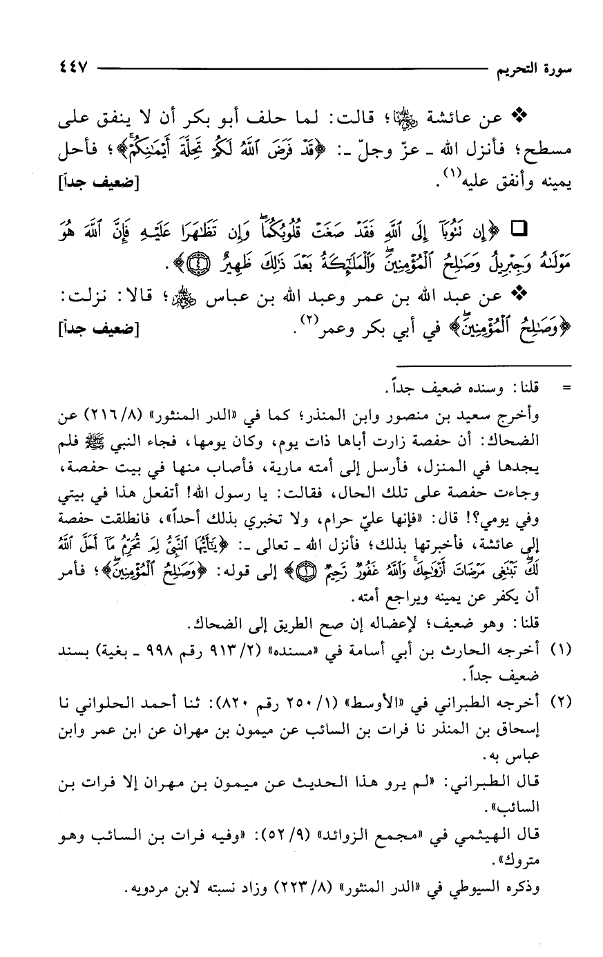 * عن عبد الله بن عمر وعبد الله بن عباس -رضي الله عنهم-؛ قالا: نزلت: {وَصَالِحُ الْمُؤْمِنِينَ} في أبي بكر وعمر (¬2). [ضعيف جداً]
