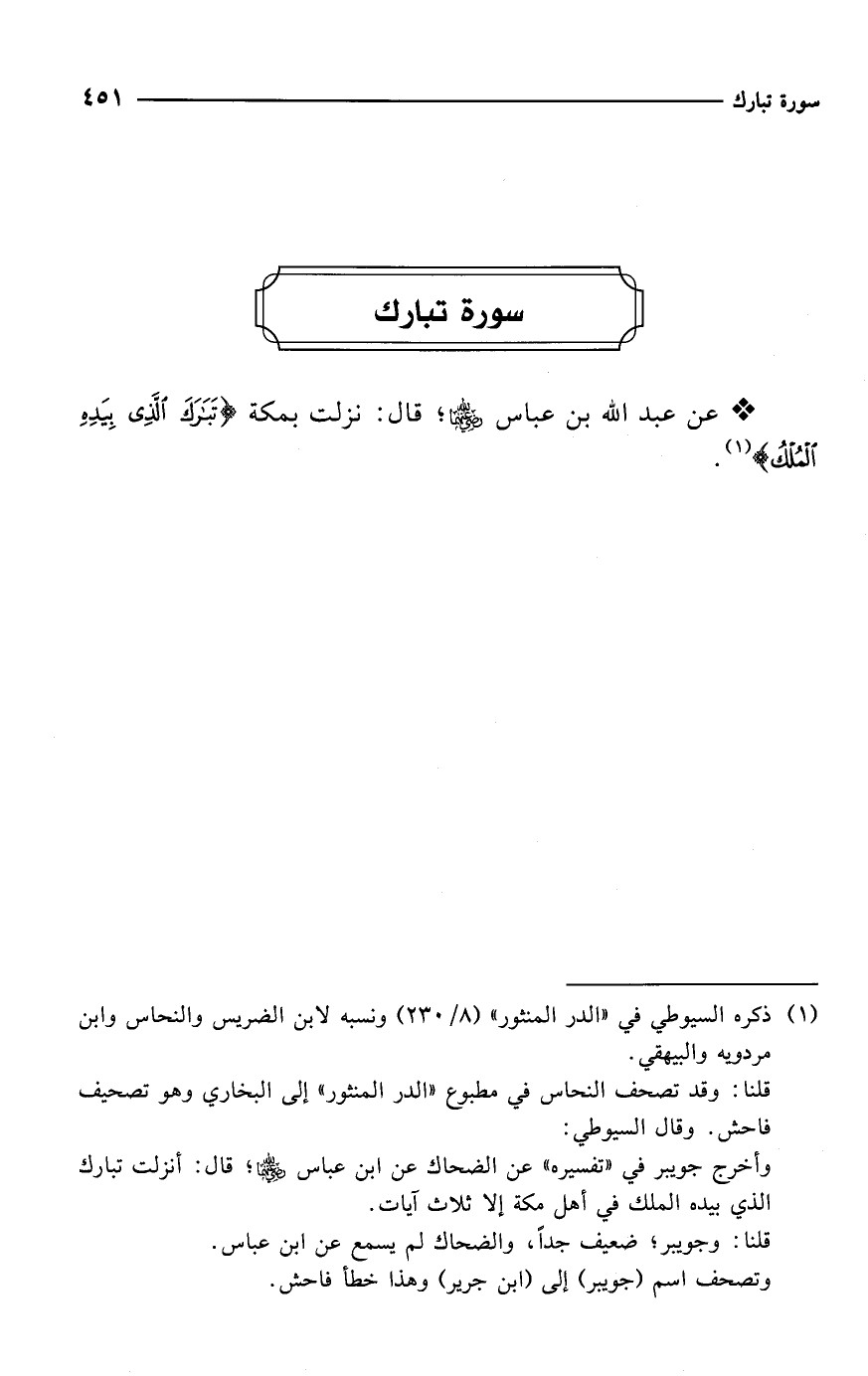 قلنا: وقد تصحف النحاس في مطبوع "الدر المنثور" إلى البخاري وهو تصحيف فاحش. وقال السيوطي: وأخرج جويبر في "تفسيره" عن الضحاك عن ابن عباس -رضي الله عنهما-؛ قال: أنزلت تبارك الذي بيده الملك في أهل مكة إلا ثلاث آيات.