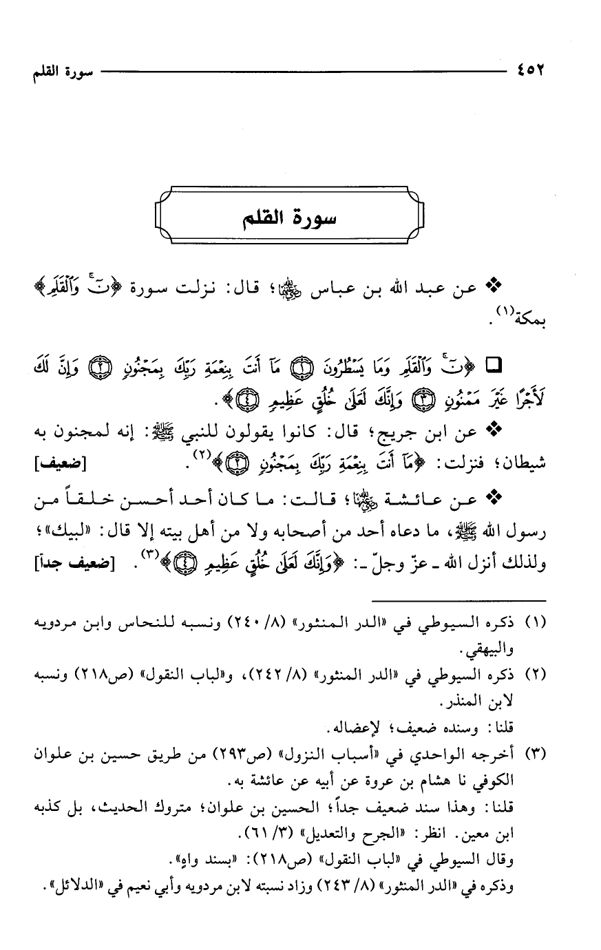 * {ن وَالْقَلَمِ وَمَا يَسْطُرُونَ (1) مَا أَنْتَ بِنِعْمَةِ رَبِّكَ بِمَجْنُونٍ (2) وَإِنَّ لَكَ لَأَجْرًا غَيْرَ مَمْنُونٍ (3) وَإِنَّكَ لَعَلَى خُلُقٍ عَظِيمٍ (4)}.