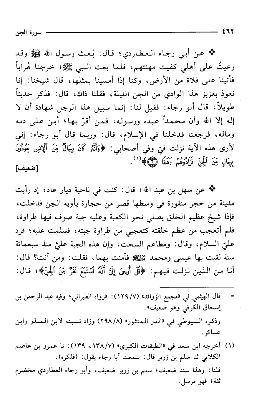 * عن أبي رجاء العطاردي؛ قال: بُعث رسول الله - صلى الله عليه وسلم - وقد رعيتُ على أهلي كفيت مهنتهم، فلما بعث النبي - صلى الله عليه وسلم -؛ خرجنا هُراباً فأتينا على فلاة من الأرض، وكنا إذا أمسينا بمثلها، قال شيخنا: إنا نعوذ بعزيز هذا الوادي من الجن الليلة، فقلنا ذاك، قال: فذكر حديثاً طويلاً، قال أبو رجاء: فقيل لنا: إنما سبيل هذا الرجل شهادة أن لا إله إلا الله وأن محمداً عبده ورسوله، فمن أقرّ بها؛ أمِن على دمه وماله، فرجعنا فدخلنا في الإِسلام، قال: وربما قال أبو رجاء: إني لأرى هذه الآية نزلت فيّ وفي أصحابي: {وَأَنَّهُ كَانَ رِجَالٌ مِنَ الْإِنْسِ يَعُوذُونَ بِرِجَالٍ مِنَ الْجِنِّ فَزَادُوهُمْ رَهَقًا (6)} (¬1). [ضعيف]