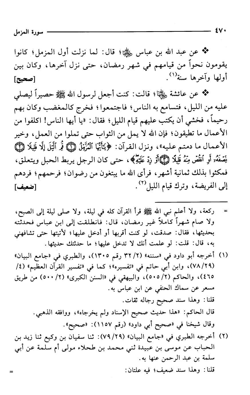 * عن عبد الله بن عباس -رضي الله عنهما-؛ قال: لما نزلت أول المزمل؛ كانوا يقومون نحواً من قيامهم في شهر رمضان، حتى نزل آخرها، وكان بين أولها وآخرها سنة (¬1). [صحيح]