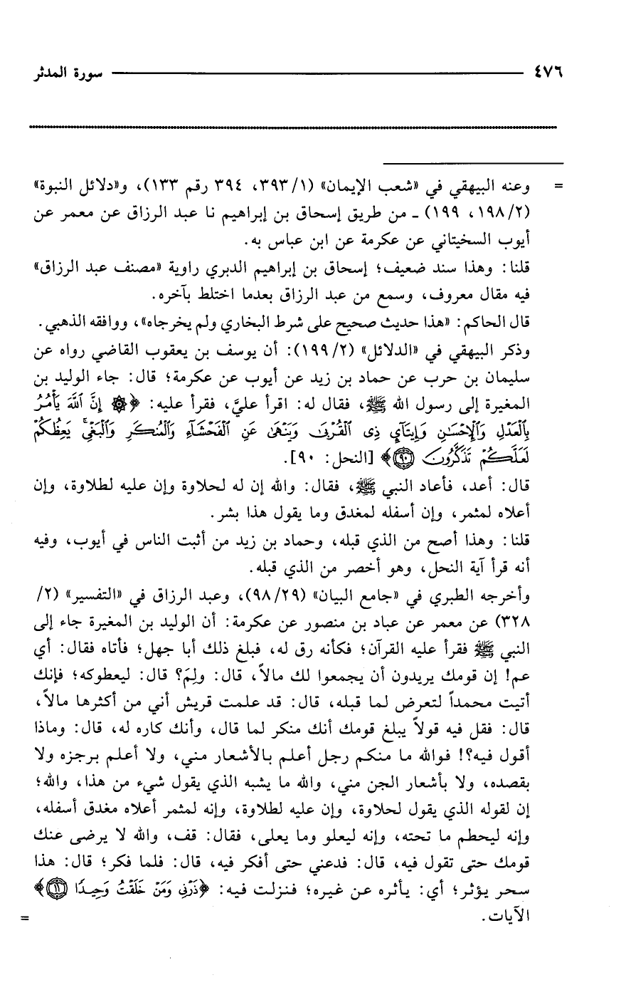 وذكر البيهقي في "الدلائل" (2/ 199): أن يوسف بن يعقوب القاضي رواه عن سليمان بن حرب عن حماد بن زيد عن أيوب عن عكرمة؛ قال: جاء الوليد بن المغيرة إلى رسول الله - صلى الله عليه وسلم -، فقال له: اقرأ عليَّ، فقرأ عليه: {إِنَّ اللَّهَ يَأْمُرُ بِالْعَدْلِ وَالْإِحْسَانِ وَإِيتَاءِ ذِي الْقُرْبَى وَيَنْهَى عَنِ الْفَحْشَاءِ وَالْمُنْكَرِ وَالْبَغْيِ يَعِظُكُمْ لَعَلَّكُمْ تَذَكَّرُونَ (90)} [النحل: 90]