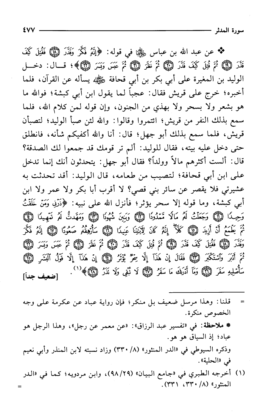 * عن عبد الله بن عباس -رضي الله عنهما- في قوله: {إِنَّهُ فَكَّرَ وَقَدَّرَ (18) فَقُتِلَ كَيْفَ قَدَّرَ (19) ثُمَّ قُتِلَ كَيْفَ قَدَّرَ (20) ثُمَّ نَظَرَ (21) ثُمَّ عَبَسَ وَبَسَرَ (22)}؛ قال: دخل الوليد بن المغيرة على أبي بكر بن أبي قحافة -رضي الله عنه- يسأله عن القرآن، فلما أخبره؛ خرج على قريش فقال: عجباً لما يقول ابن أبي كبشة؛ فوالله ما هو بشعر ولا بسحر ولا بهذي من الجنون، وإن قوله لمن كلام الله، فلما سمع بذلك النفر من قريش؛ ائتمروا وقالوا: والله لئن صبأ الوليد؛ لتصبأن قريش، فلما سمع بذلك أبو جهل؛ قال: أنا والله أكفيكم شأنه، فانطلق حتى دخل عليه بيته، فقال للوليد: ألم تر قومك قد جمعوا لك الصدقة؟ قال: ألست أكثرهم مالاً وولداً؟ فقال أبو جهل: يتحدثون أنك إنما تدخل على ابن أبي قحافة؛ لتصيب من طعامه، قال الوليد: أقد تحدثت به عشيرتي فلا يقصر عن سائر بني قصي؟ لا أقرب أبا بكر ولا عمر ولا ابن أبي كبشة، وما قوله إلا سحر يؤثر؛ فأنزل الله على نبيه: {ذَرْنِي وَمَنْ خَلَقْتُ وَحِيدًا (11) وَجَعَلْتُ لَهُ مَالًا مَمْدُودًا (12) وَبَنِينَ شُهُودًا (13) وَمَهَّدْتُ لَهُ تَمْهِيدًا (14) ثُمَّ يَطْمَعُ أَنْ أَزِيدَ (15) كَلَّا إِنَّهُ كَانَ لِآيَاتِنَا عَنِيدًا (16) سَأُرْهِقُهُ صَعُودًا (17) إِنَّهُ فَكَّرَ وَقَدَّرَ (18) فَقُتِلَ كَيْفَ قَدَّرَ (19) ثُمَّ قُتِلَ كَيْفَ قَدَّرَ (20) ثُمَّ نَظَرَ (21) ثُمَّ عَبَسَ وَبَسَرَ (22) ثُمَّ أَدْبَرَ وَاسْتَكْبَرَ (23) فَقَالَ إِنْ هَذَا إِلَّا سِحْرٌ يُؤْثَرُ (24) إِنْ هَذَا إِلَّا قَوْلُ الْبَشَرِ (25) سَأُصْلِيهِ سَقَرَ (26) وَمَا أَدْرَاكَ مَا سَقَرُ (27) لَا تُبْقِي وَلَا تَذَرُ (28)} (¬1). [ضعيف جداً]
