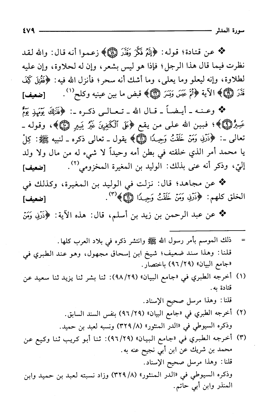 * عن قتادة؛ قوله: {إِنَّهُ فَكَّرَ وَقَدَّرَ (18)} زعموا أنه قال: والله لقد نظرت فيما قال هذا الرجل؛ فإذا هو ليس بشعر، وإن له لحلاوة، وإن عليه لطلاوة، وإنه ليعلو وما يعلى، وما أشك أنه سحر؛ فأنزل الله فيه: {فَقُتِلَ كَيْفَ قَدَّرَ (19)} الآية {ثُمَّ عَبَسَ وَبَسَرَ (22} قبض ما بين عينيه وكلح (¬1). [ضعيف] * وعنه -أيضاً- قال الله -تعالى ذكره-: {فَذَلِكَ يَوْمَئِذٍ يَوْمٌ عَسِيرٌ (9)}؛ فبين الله على من يقع {عَلَى الْكَافِرِينَ غَيْرُ يَسِيرٍ (10)}، وقوله -تعالى-: {ذَرْنِي وَمَنْ خَلَقْتُ وَحِيدًا (11)} يقول -تعالى ذكره- لنبيه - صلى الله عليه وسلم -: كِلْ يا محمد أمر الذي خلقته في بطن أمه وحيداً لا شيء له من مال ولا ولد إليّ، وذكر أنه عنى بذلك: الوليد بن المغيرة المخزومي (¬2). [ضعيف]
