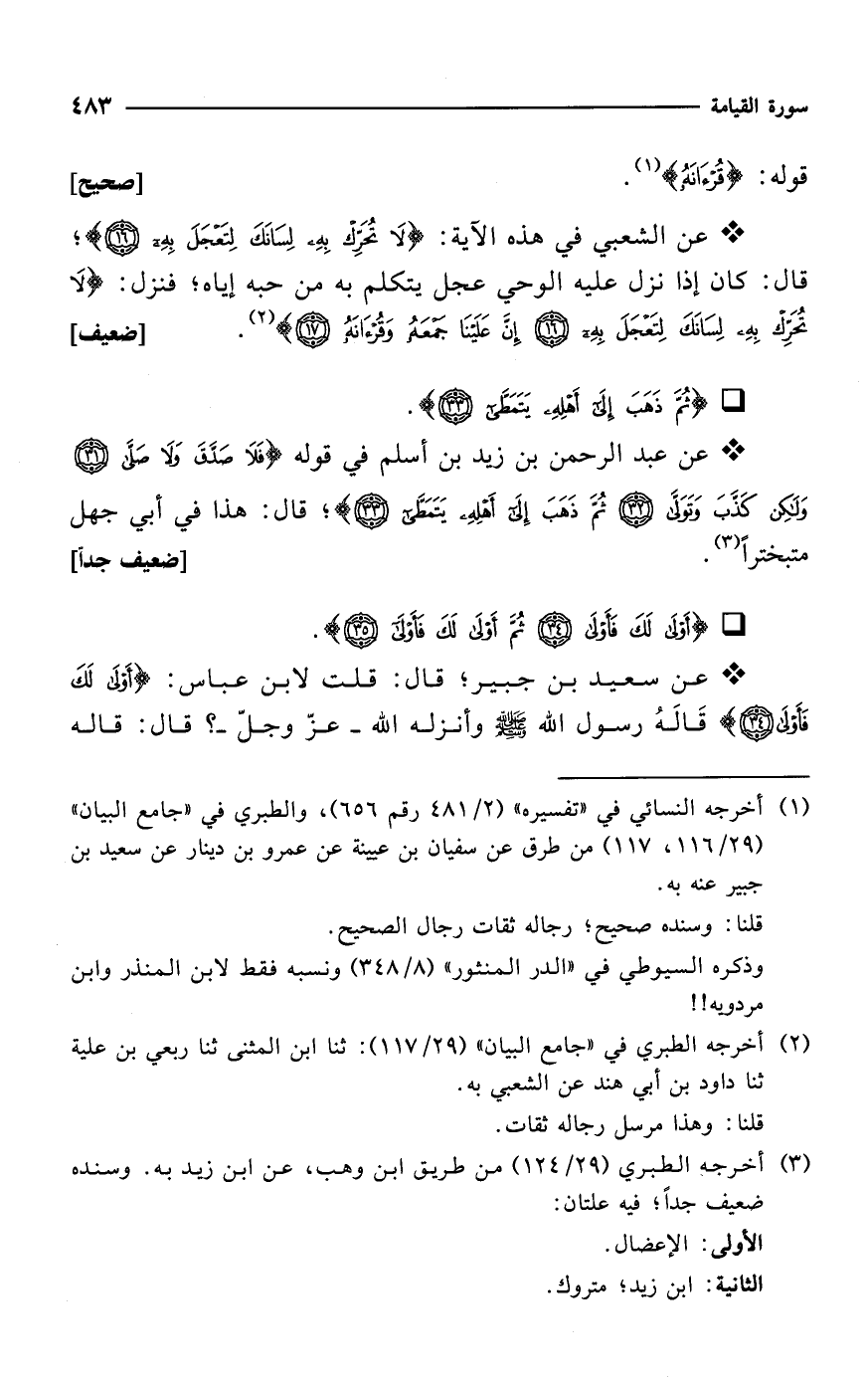 * عن الشعبي في هذه الآية: {لَا تُحَرِّكْ بِهِ لِسَانَكَ لِتَعْجَلَ بِهِ (16)}؛ قال: كان إذا نزل عليه الوحي عجل يتكلم به من حبه إياه؛ فنزل: {لَا تُحَرِّكْ بِهِ لِسَانَكَ لِتَعْجَلَ بِهِ (16) إِنَّ عَلَيْنَا جَمْعَهُ وَقُرْآنَهُ (17)} (¬2). [ضعيف]