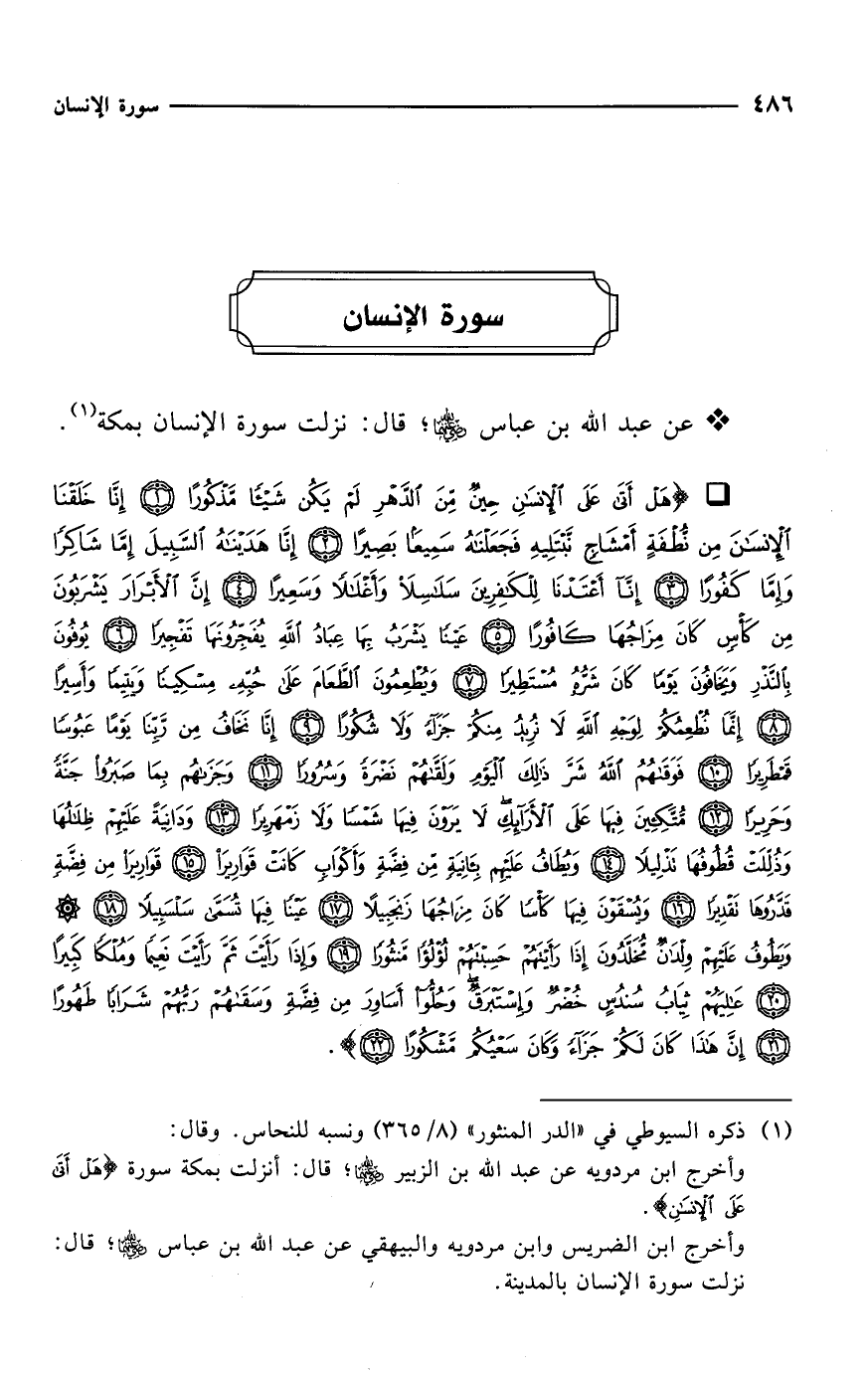 * عن عبد الله بن عباس -رضي الله عنهما-؛ قال: نزلت سورة الإنسان بمكة (¬1).