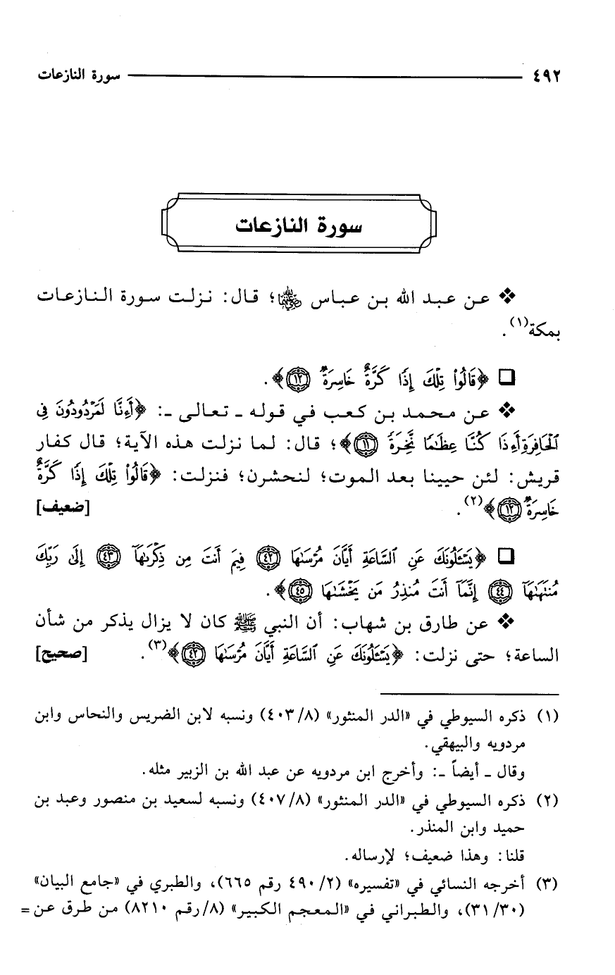 * عن عبد الله بن عباس -رضي الله عنهما-؛ قال: نزلت سورة النازعات بمكة (¬1).