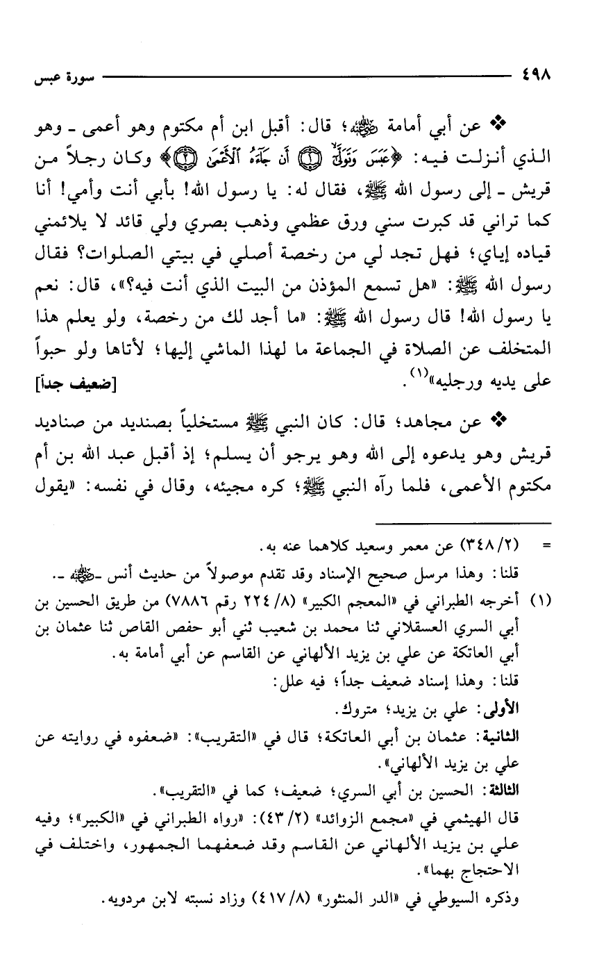 * عن مجاهد؛ قال: كان النبي - صلى الله عليه وسلم - مستخلياً بصنديد من صناديد قريش وهو يدعوه إلى الله وهو يرجو أن يسلم؛ إذ أقبل عبد الله بن أم مكتوم الأعمى، فلما رآه النبي - صلى الله عليه وسلم -؛ كره مجيئه، وقال فى نفسه: "يقول