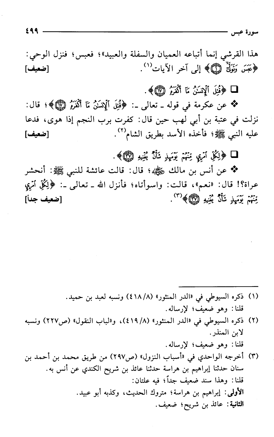 هذا القرشي إنما أتباعه العميان والسفلة والعبيد"؛ فعبس؛ فنزل الوحي: {عَبَسَ وَتَوَلَّى (1)} إلى آخر الآيات (¬1). [ضعيف]