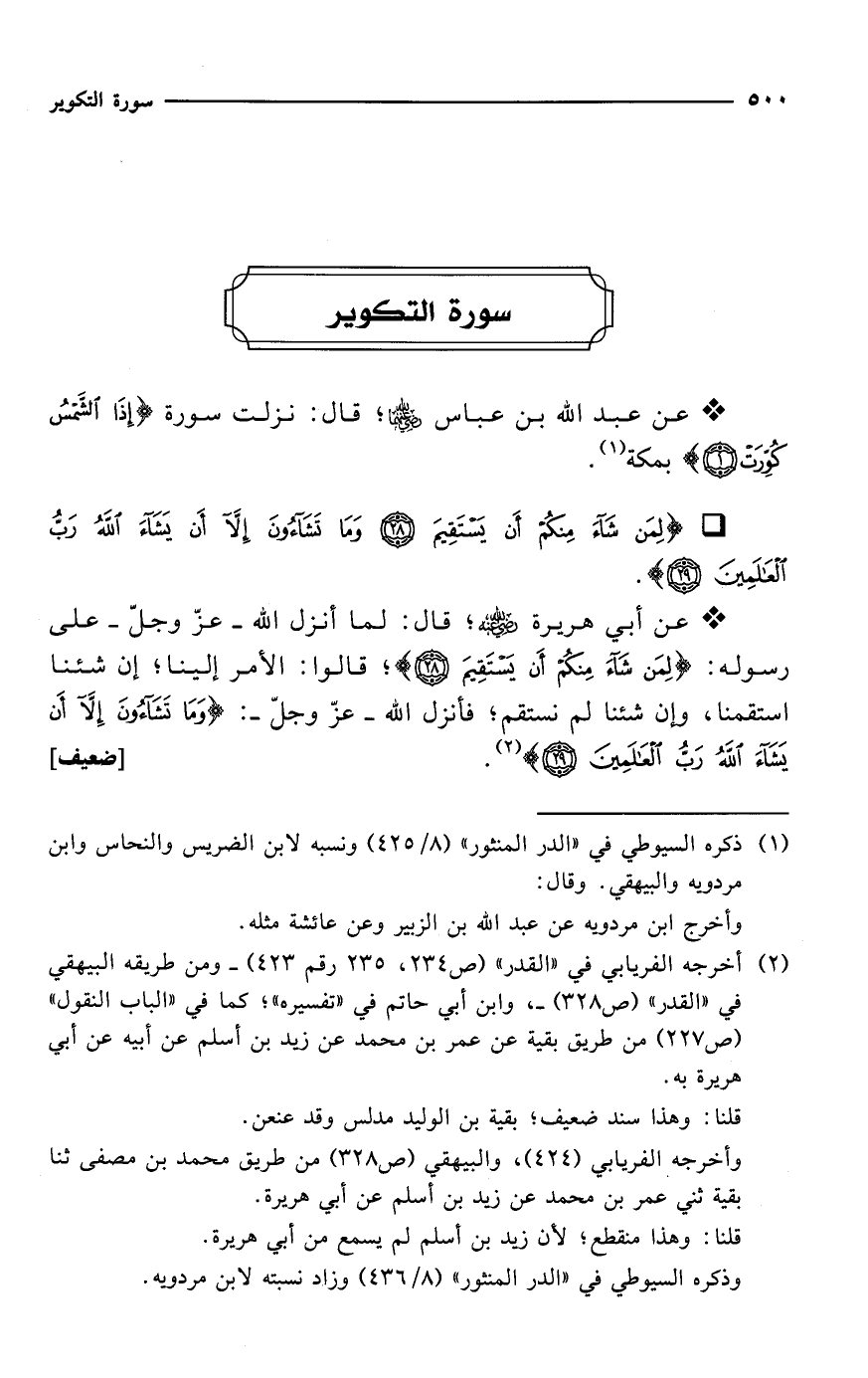 * عن أبي هريرة -رضي الله عنه-؛ قال: لما أنزل الله -عزّ وجلّ- على رسوله: {لِمَنْ شَاءَ مِنْكُمْ أَنْ يَسْتَقِيمَ (28)}؛ قالوا: الأمر إلينا؛ إن شئنا استقمنا، وإن شئنا لم نستقم؛ فأنزل الله -عزّ وجلّ-: {وَمَا تَشَاءُونَ إِلَّا أَنْ يَشَاءَ اللَّهُ رَبُّ الْعَالَمِينَ (29)} (¬2). [ضعيف]