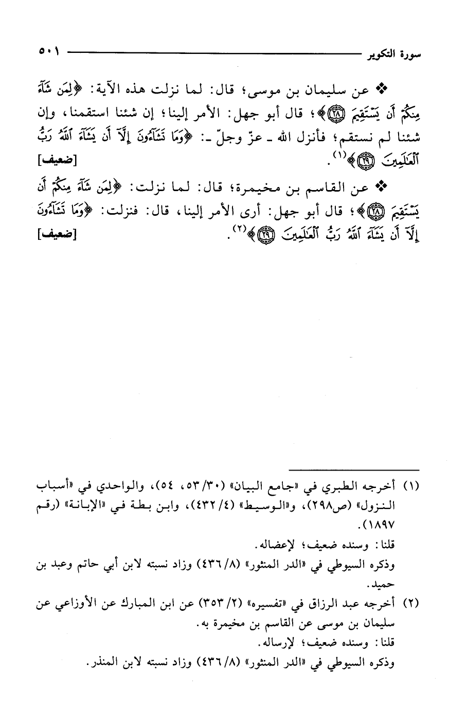 * عن القاسم بن مخيمرة؛ قال: لما نزلت: {لِمَنْ شَاءَ مِنْكُمْ أَنْ يَسْتَقِيمَ (28)}؛ قال أبو جهل: أرى الأمر إلينا، قال: فنزلت: {وَمَا تَشَاءُونَ إِلَّا أَنْ يَشَاءَ اللَّهُ رَبُّ الْعَالَمِينَ (29)} (¬2). [ضعيف]