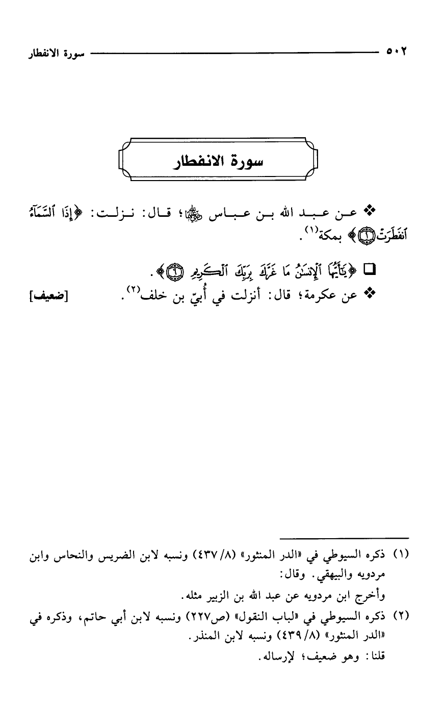 * عن عبد الله بن عباس -رضي الله عنهما-؛ قال: نزلت: {إِذَا السَّمَاءُ انْفَطَرَتْ (1)} بمكة (¬1).