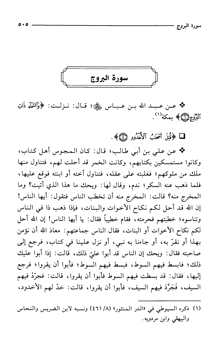 * عن عبد الله بن عباس -رضي الله عنهما-؛ قال: نزلت: {وَالسَّمَاءِ ذَاتِ الْبُرُوجِ (1)} بمكة (¬1).