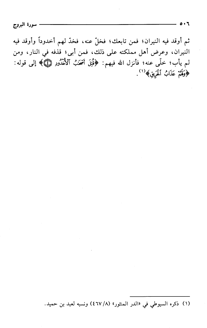 ثم أوقد فيه النيران؛ فمن تابعك؛ فخلّ عنه، فخدّ لهم أخدوداً وأوقد فيه النيران، وعرض أهل مملكته على ذلك، فمن أبى؛ قذفه في النار، ومن لم يأب؛ خلّى عنه؛ فأنزل الله فيهم: {قُتِلَ أَصْحَابُ الْأُخْدُودِ (4)} إلى قوله: {وَلَهُمْ عَذَابُ الْحَرِيقِ} (¬1).