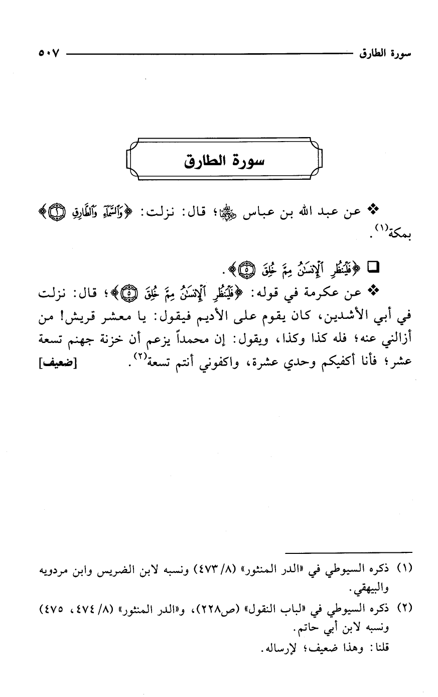 * عن عكرمة في قوله: {فَلْيَنْظُرِ الْإِنْسَانُ مِمَّ خُلِقَ (5)}؛ قال: نزلت في أبي الأشدين، كان يقوم على الأديم فيقول: يا معشر قريش! من أزالني عنه؛ فله كذا وكذا، ويقول: إن محمداً يزعم أن خزنة جهنم تسعة عشر؛ فأنا أكفيكم وحدي عشرة، واكفوني أنتم تسعة (¬2). [ضعيف]