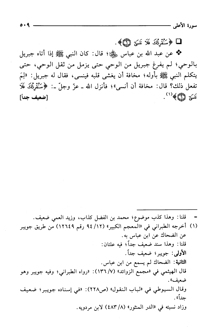 * عن عبد الله بن عباس -رضي الله عنهما-؛ قال: كان النبي - صلى الله عليه وسلم - إذا أتاه جبريل بالوحي؛ لم يفرغ جبريل من الوحي حتى يزمل من ثقل الوحي، حتى يتكلم النبي - صلى الله عليه وسلم - بأوله؛ مخافة أن يغشى قلبه فينسى، فقال له جبريل: "لِمَ تفعل ذلك؟ قال: مخافة أن أنسى"؛ فأنزل الله -عزّ وجلّ-: {سَنُقْرِئُكَ فَلَا تَنْسَى (6)} (¬1). [ضعيف جداً]