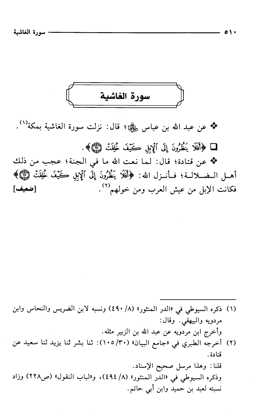 * عن قتادة؛ قال: لما نعت الله ما في الجنة؛ عجب من ذلك أهل الضلالة؛ فأنزل الله: {أَفَلَا يَنْظُرُونَ إِلَى الْإِبِلِ كَيْفَ خُلِقَتْ (17)} فكانت الإبل من عيش العرب ومن خولهم (¬2). [ضعيف]