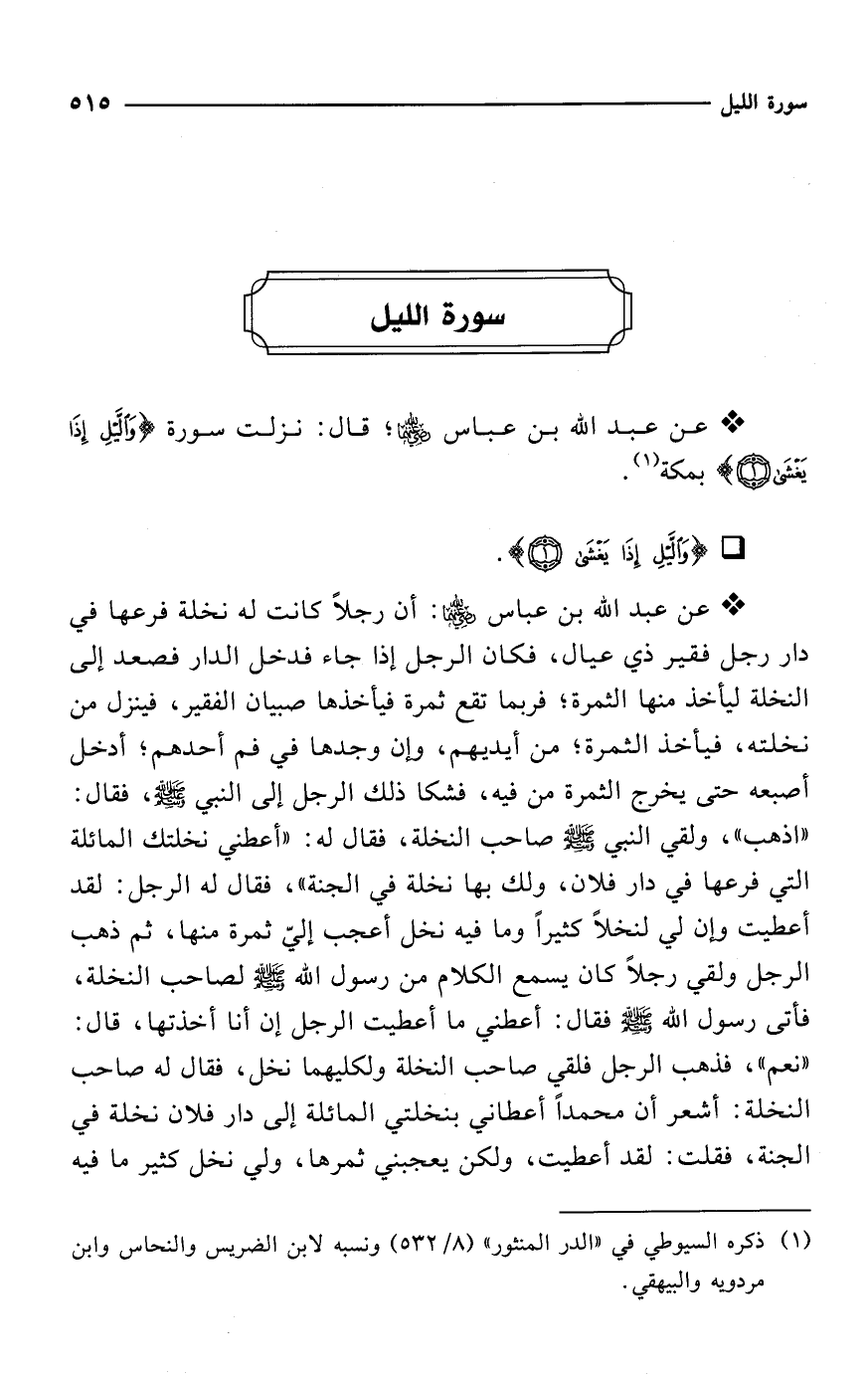 * عن عبد الله بن عباس -رضي الله عنهما-؛ قال: نزلت سورة {وَاللَّيْلِ إِذَا يَغْشَى (1)} وبمكة (¬1).