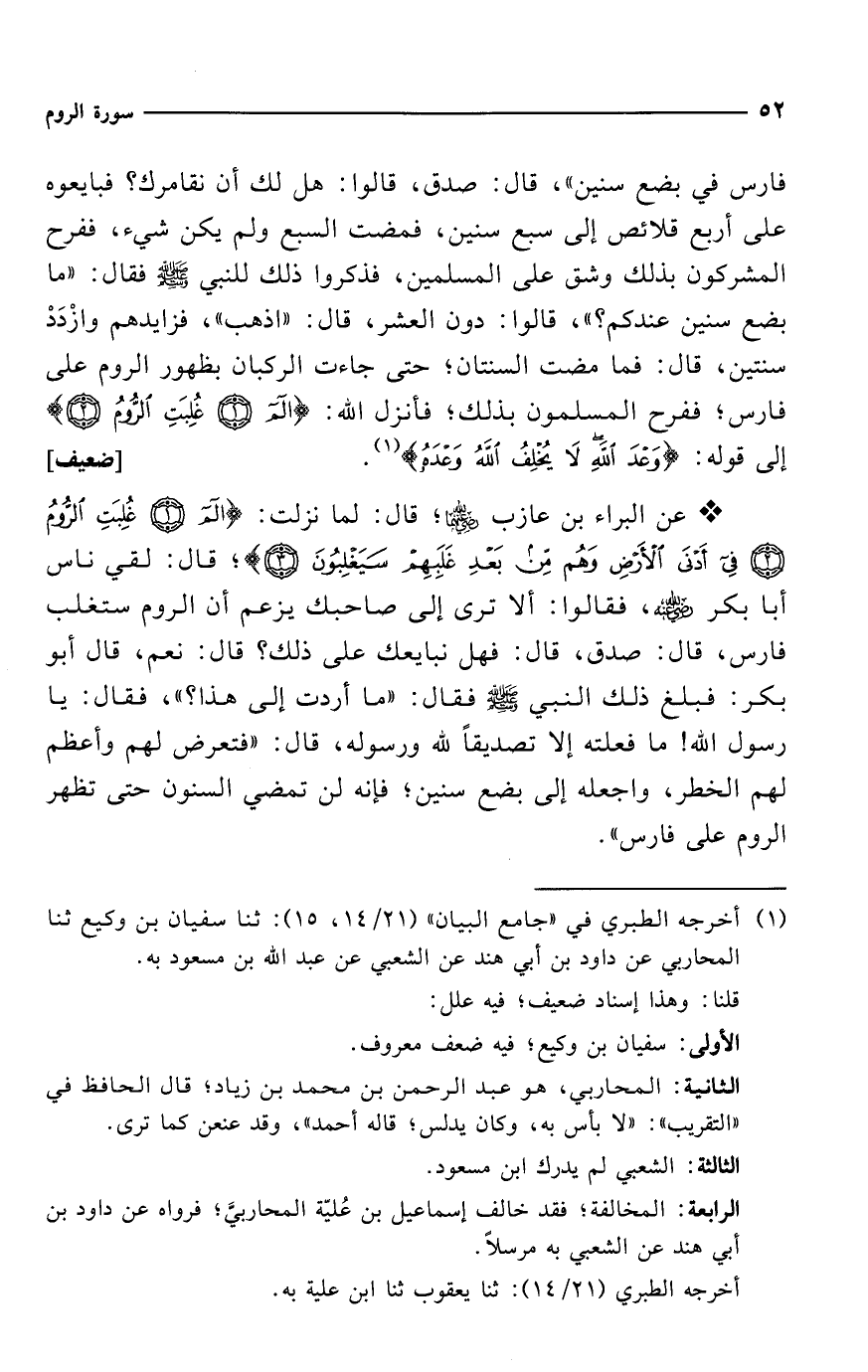 * عن البراء بن عازب -رضي الله عنهما-؛ قال: لما نزلت: {الم (1) غُلِبَتِ الرُّومُ (2) فِي أَدْنَى الْأَرْضِ وَهُمْ مِنْ بَعْدِ غَلَبِهِمْ سَيَغْلِبُونَ (3)}؛ قال: لقي ناس أبا بكر -رضي الله عنه-، فقالوا: ألا ترى إلى صاحبك يزعم أن الروم ستغلب فارس، قال: صدق، قال: فهل نبايعك على ذلك؟ قال: نعم، قال أبو بكر: فبلغ ذلك النبي - صلى الله عليه وسلم - فقال: "ما أردت إلى هذا؟ "، فقال: يا رسول الله! ما فعلته إلا تصديقاً لله ورسوله، قال: "فتعرض لهم وأعظم لهم الخطر، واجعله إلى بضع سنين؛ فإنه لن تمضي السنون حتى تظهر الروم على فارس".