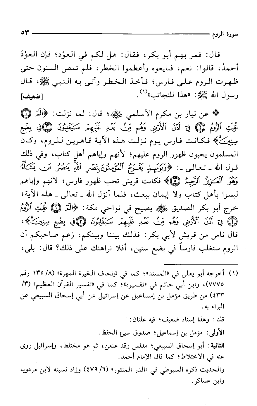* عن نيار بن مكرم الأسلمي -رضي الله عنه-؛ قال: لما نزلت: {الم (1) غُلِبَتِ الرُّومُ (2) فِي أَدْنَى الْأَرْضِ وَهُمْ مِنْ بَعْدِ غَلَبِهِمْ سَيَغْلِبُونَ (3) فِي بِضْعِ سِنِينَ} فكانت فارس يوم نزلت هذه الآية قاهرين للروم، وكان المسلمون يحبون ظهور الروم عليهم؛ لأنهم وإياهم أهل كتاب، وفي ذلك قول الله -تعالى-: {وَيَوْمَئِذٍ يَفْرَحُ الْمُؤْمِنُونَ (4) بِنَصْرِ اللَّهِ يَنْصُرُ مَنْ يَشَاءُ وَهُوَ الْعَزِيزُ الرَّحِيمُ (5)} فكانت قريش تحب ظهور فارس؛ لأنهم وإياهم ليسوا بأهل كتاب ولا إيمان ببعث، فلما أنزل الله -تعالى- هذه الآية؛ خرج أبو بكر الصديق -رضي الله عنه- يصيح في نواحي مكة: {الم (1) غُلِبَتِ الرُّومُ (2) فِي أَدْنَى الْأَرْضِ وَهُمْ مِنْ بَعْدِ غَلَبِهِمْ سَيَغْلِبُونَ (3) فِي بِضْعِ سِنِينَ}، قال ناس من قريش لأبي بكر: فذلك بيننا وبينكم، زعم صاحبكم أن الروم ستغلب فارساً في بضع سنين، أفلا نراهنك على ذلك؟ قال: بلى،