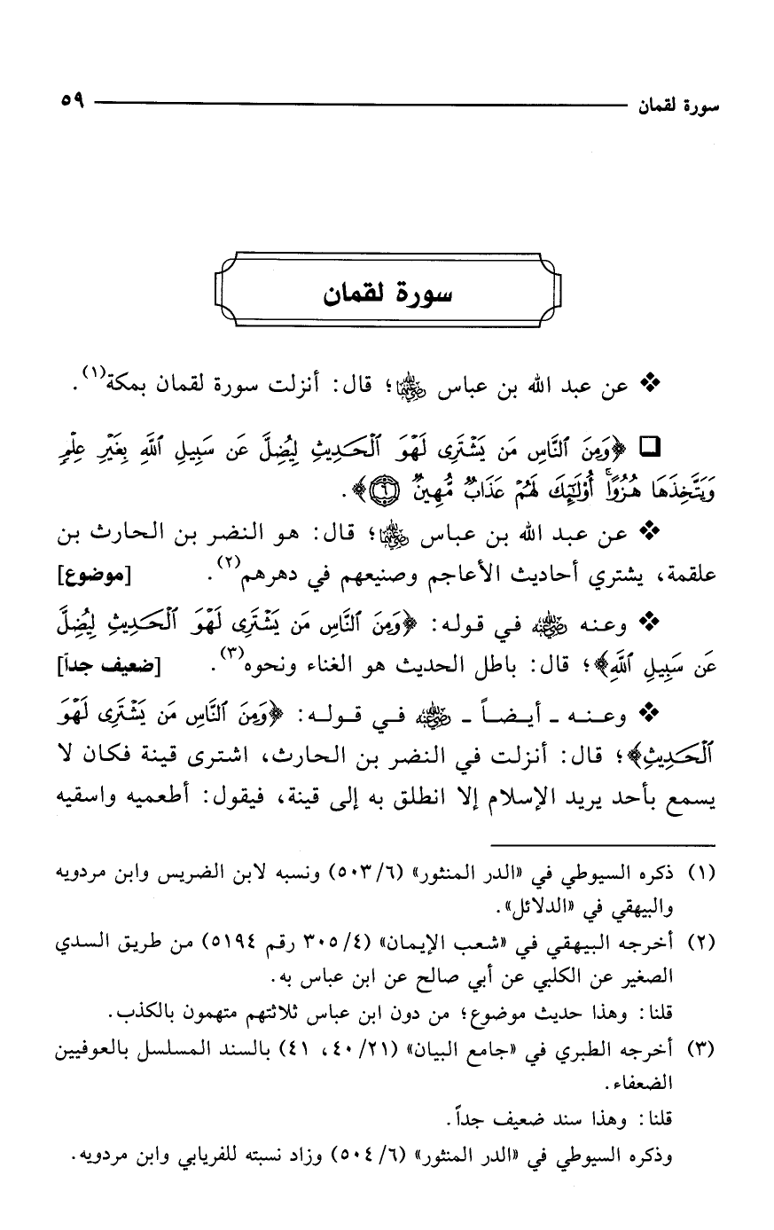 * عن عبد الله بن عباس -رضي الله عنهما-؛ قال: هو النضر بن الحارث بن علقمة، يشتري أحاديث الأعاجم وصنيعهم في دهرهم (¬2). [موضوع]