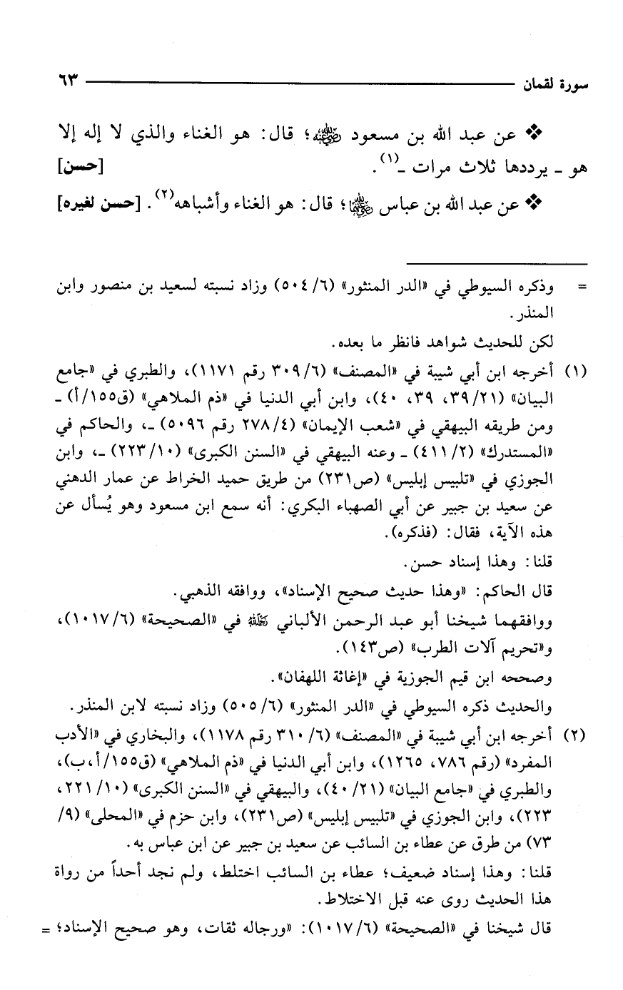 (¬2) أخرجه ابن أبي شيبة في "المصنف" (6/ 310 رقم 1178)، والبخاري في "الأدب المفرد" (رقم 786، 1265)، وابن أبي الدنيا في "ذم الملاهي" (ق 155/ أ، ب)، والطبري في "جامع البيان" (21/ 40)، والبيهقي في "السنن الكبرى" (10/ 221، 223)، وابن الجوزي في "تلبيس إبليس" (ص 231)، وابن حزم في "المحلى" (9/ 73) من طرق عن عطاء بن السائب عن سعيد بن جبير عن ابن عباس به.
