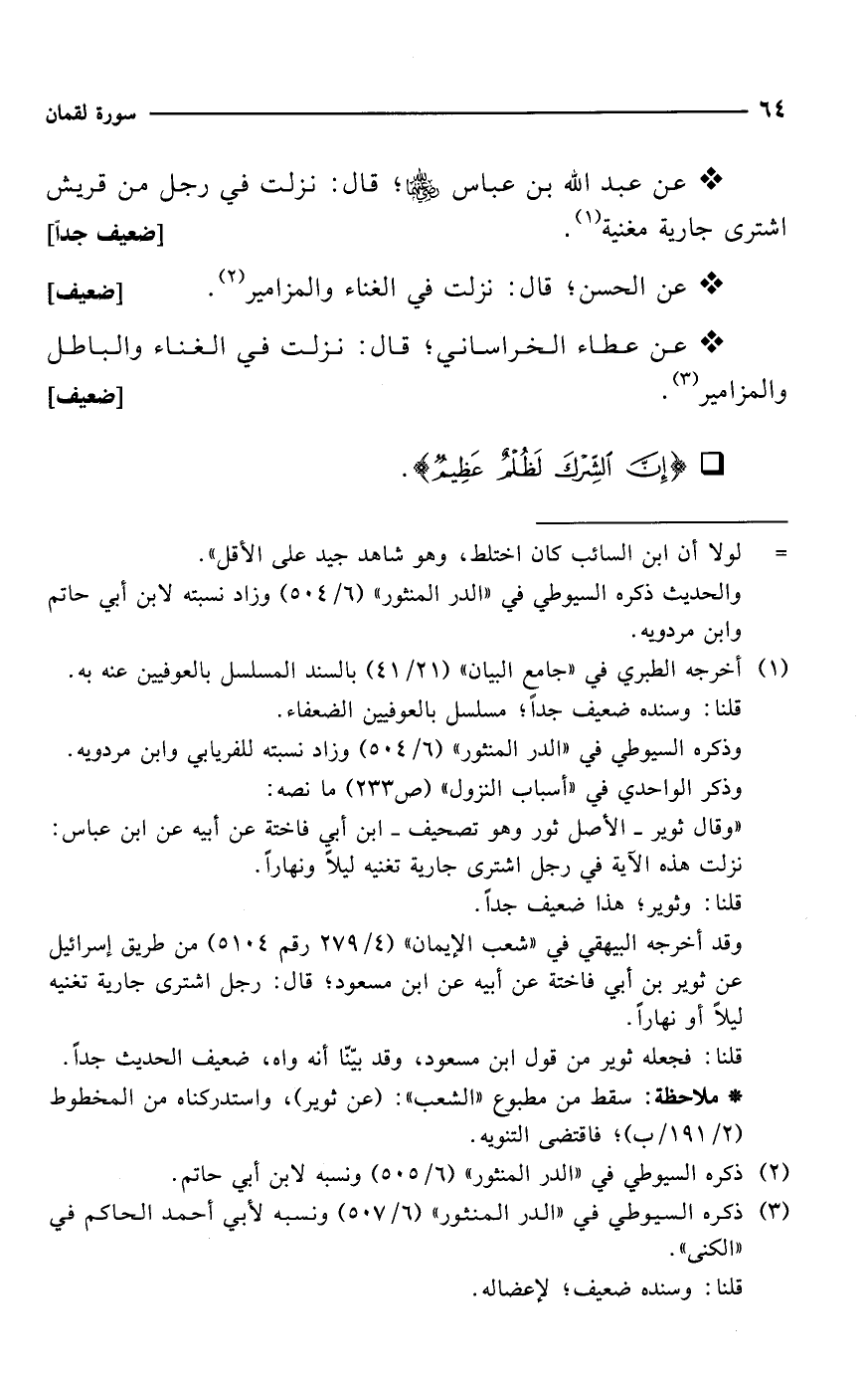 "وقال ثوير -الأصل ثور وهو تصحيف- ابن أبي فاختة عن أبيه عن ابن عباس: نزلت هذه الآية في رجل اشترى جارية تغنيه ليلاً ونهاراً.