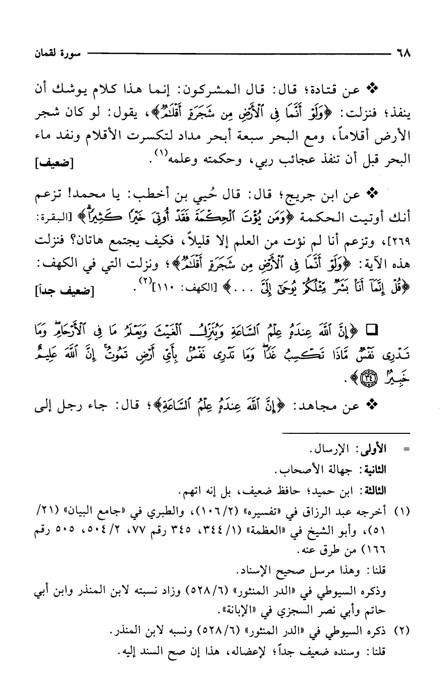 * عن ابن جريج؛ قال: قال حُيي بن أخطب: يا محمد! تزعم أنك أوتيت الحكمة {وَمَنْ يُؤْتَ الْحِكْمَةَ فَقَدْ أُوتِيَ خَيْرًا كَثِيرًا} [البقرة: 269]، وتزعم أنا لم نؤت من العلم إلا قليلاً، فكيف يجتمع هاتان؟ فنزلت هذه الآية: {وَلَوْ أَنَّمَا في الْأَرْضِ مِنْ شَجَرَةٍ أَقْلَامٌ}؛ ونزلت التي في الكهف: {قُلْ إِنَّمَا أَنَا بَشَرٌ مِثْلُكُمْ يُوحَى إِلَيَّ. . .} [الكهف: 110] (¬2). [ضعيف جداً]