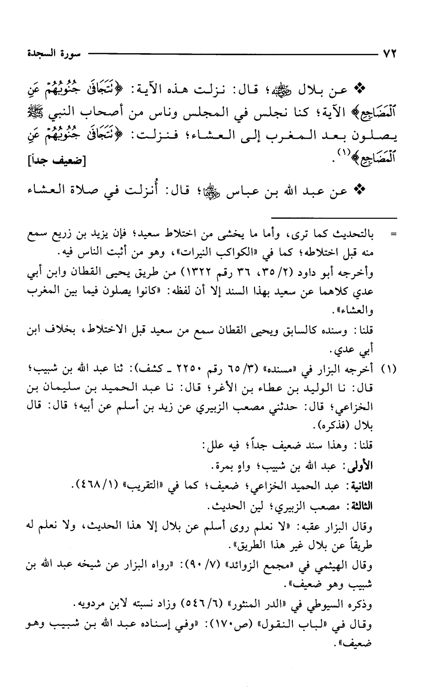 * عن بلال -رضي الله عنه-؛ قال: نزلت هذه الآية: {تَتَجَافَى جُنُوبُهُمْ عَنِ الْمَضَاجِعِ} الآية؛ كنا نجلس في المجلس وناس من أصحاب النبي - صلى الله عليه وسلم - يصلون بعد المغرب إلى العشاء؛ فنزلت: {تَتَجَافَى جُنُوبُهُمْ عَنِ الْمَضَاجِعِ} (¬1). [ضعيف جداً]