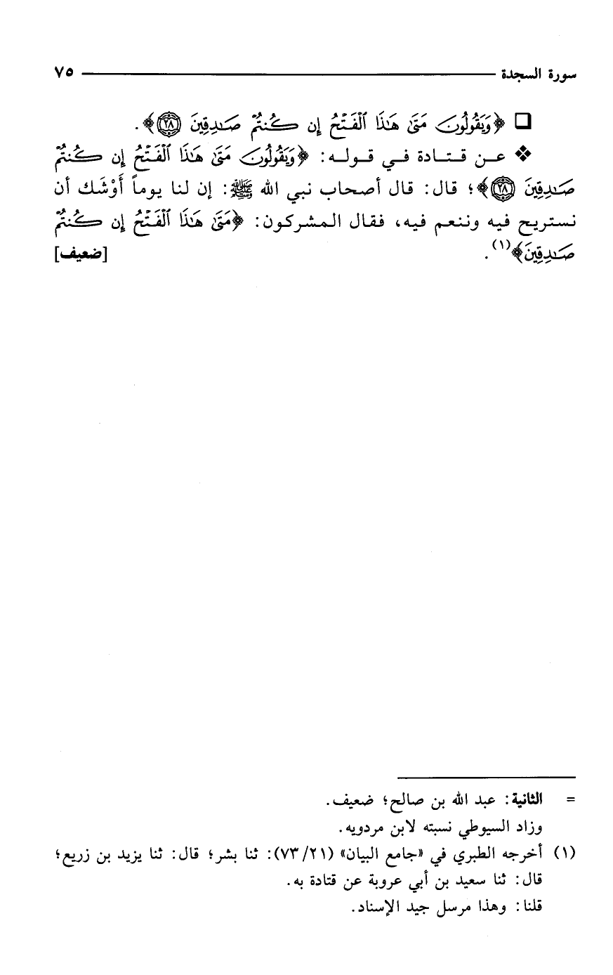 * عن قتادة في قوله: {وَيَقُولُونَ مَتَى هَذَا الْفَتْحُ إِنْ كُنْتُمْ صَادِقِينَ (28)}؛ قال: قال أصحاب نبي الله - صلى الله عليه وسلم -: إن لنا يوماً أَوْشَك أن نستريح فيه وننعم فيه، فقال المشركون: {مَتَى هَذَا الْفَتْحُ إِنْ كُنْتُمْ صَادِقِينَ} (¬1). [ضعيف]