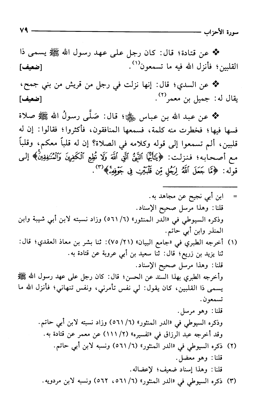 * عن قتادة؛ قال: كان رجل على عهد رسول الله - صلى الله عليه وسلم - يسمى ذا القلبين؛ فأنزل الله فيه ما تسمعون (¬1). [ضعيف]