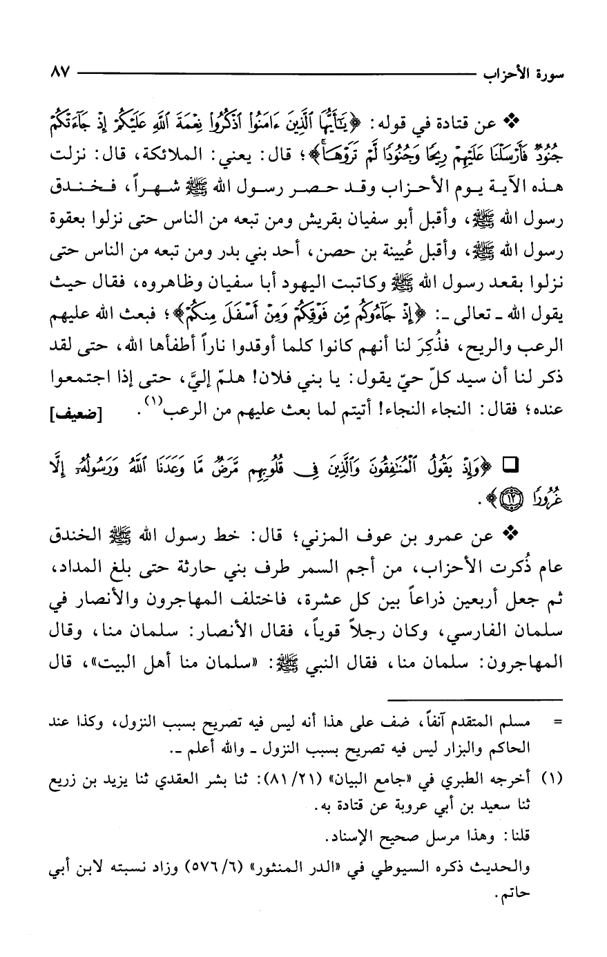 * عن قتادة في قوله: {يَاأَيُّهَا الَّذِينَ آمَنُوا اذْكُرُوا نِعْمَةَ اللَّهِ عَلَيْكُمْ إِذْ جَاءَتْكُمْ جُنُودٌ فَأَرْسَلْنَا عَلَيْهِمْ رِيحًا وَجُنُودًا لَمْ تَرَوْهَا}؛ قال: يعني: الملائكة، قال: نزلت هذه الآية يوم الأحزاب وقد حصر رسول الله - صلى الله عليه وسلم - شهراً، فخندق رسول الله - صلى الله عليه وسلم -، وأقبل أبو سفيان بقريش ومن تبعه من الناس حتى نزلوا بعقوة رسول الله - صلى الله عليه وسلم -، وأقبل عُيينة بن حصن، أحد بني بدر ومن تبعه من الناس حتى نزلوا بقعد رسول الله - صلى الله عليه وسلم - وكاتبت اليهود أبا سفيان وظاهروه، فقال حيث يقول الله -تعالى-: {إِذْ جَاءُوكُمْ مِنْ فَوْقِكُمْ وَمِنْ أَسْفَلَ مِنْكُمْ}؛ فبعث الله عليهم الرعب والريح، فذُكِرَ لنا أنهم كانوا كلما أوقدوا ناراً أطفأها الله، حتى لقد ذكر لنا أن سيد كلّ حيّ يقول: يا بني فلان! هلمّ إليَّ، حتى إذا اجتمعوا عنده؛ فقال: النجاء النجاء! أتيتم لما بعث عليهم من الرعب (¬1). [ضعيف]