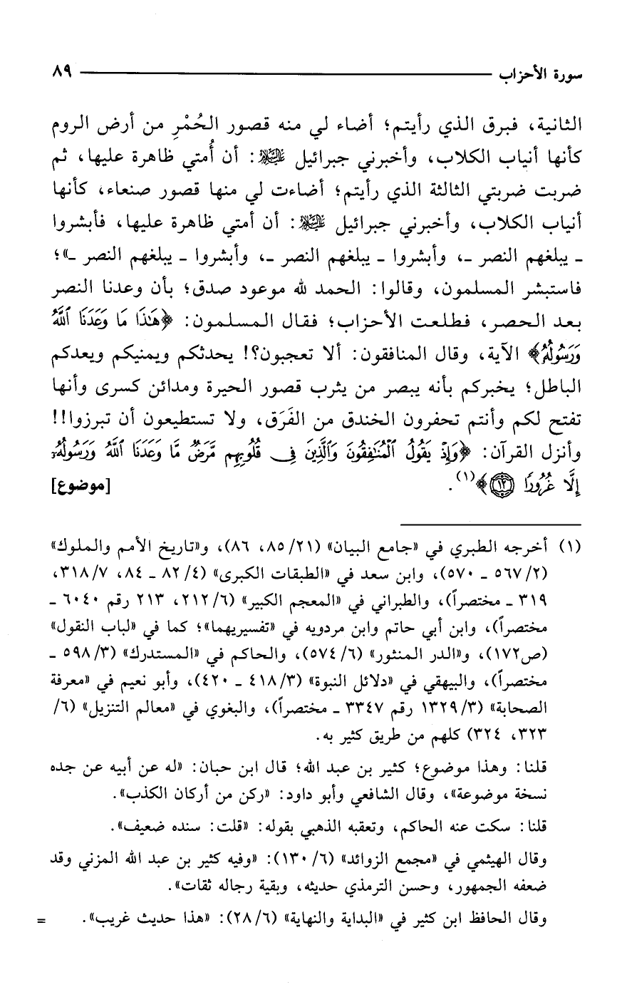 (¬1) أخرجه الطبري في "جامع البيان" (21/ 85، 86)، و"تاريخ الأمم والملوك" (2/ 567 - 570)، وابن سعد في "الطبقات الكبرى" (4/ 82 - 84، 7/ 318، 319 - مختصراً)، والطبراني في "المعجم الكبير" (6/ 212، 213 رقم 6040 - مختصراً)، وابن أبي حاتم وابن مردويه في "تفسيريهما"؛ كما في "لباب النقول" (ص 172)، و"الدر المنثور" (6/ 574)، والحاكم في "المستدرك" (3/ 598 - مختصراً)، والبيهقي في "دلائل النبوة" (3/ 418 - 420)، وأبو نعيم في "معرفة الصحابة" (3/ 1329 رقم 3347 - مختصراً)، والبغوي في "معالم التنزيل" (6/ 323، 324) كلهم من طريق كثير به.