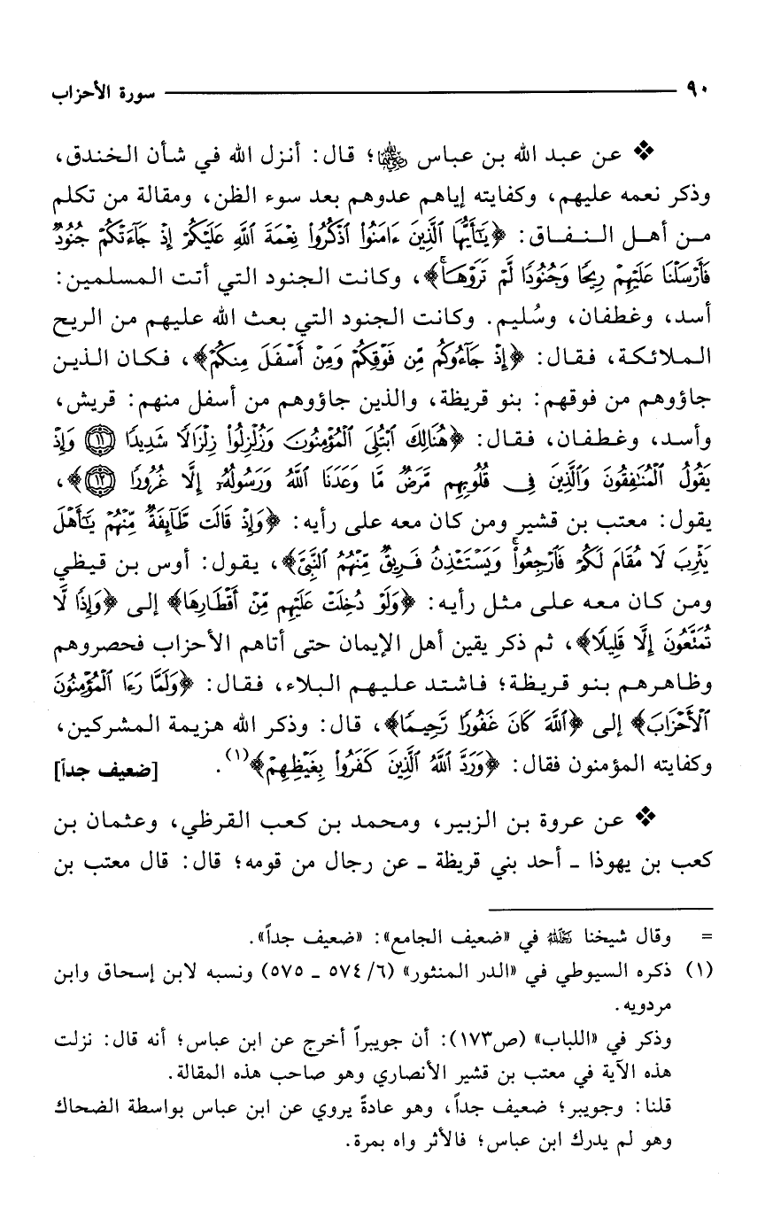 * عن عبد الله بن عباس -رضي الله عنهما-؛ قال: أنزل الله في شأن الخندق، وذكر نعمه عليهم، وكفايته إياهم عدوهم بعد سوء الظن، ومقالة من تكلم من أهل النفاق: {يَاأَيُّهَا الَّذِينَ آمَنُوا اذْكُرُوا نِعْمَةَ اللَّهِ عَلَيْكُمْ إِذْ جَاءَتْكُمْ جُنُودٌ فَأَرْسَلْنَا عَلَيْهِمْ رِيحًا وَجُنُودًا لَمْ تَرَوْهَا}، وكانت الجنود التي أتت المسلمين: أسد، وغطفان، وسُليم. وكانت الجنود التي بعث الله عليهم من الريح الملائكة، فقال: {إِذْ جَاءُوكُمْ مِنْ فَوْقِكُمْ وَمِنْ أَسْفَلَ مِنْكُمْ}، فكان الذين جاؤوهم من فوقهم: بنو قريظة، والذين جاؤوهم من أسفل منهم: قريش، وأسد، وغطفان، فقال: {هُنَالِكَ ابْتُلِيَ الْمُؤْمِنُونَ وَزُلْزِلُوا زِلْزَالًا شَدِيدًا (11) وَإِذْ يَقُولُ الْمُنَافِقُونَ وَالَّذِينَ فِي قُلُوبِهِمْ مَرَضٌ مَا وَعَدَنَا اللَّهُ وَرَسُولُهُ إِلَّا غُرُورًا (12)}، يقول: معتب بن قشير ومن كان معه على رأيه: {وَإِذْ قَالَتْ طَائِفَةٌ مِنْهُمْ يَاأَهْلَ يَثْرِبَ لَا مُقَامَ لَكُمْ فَارْجِعُوا وَيَسْتَأْذِنُ فَرِيقٌ مِنْهُمُ النَّبِيَّ}، يقول: أوس بن قيظي ومن كان معه على مثل رأيه: {وَلَوْ دُخِلَتْ عَلَيْهِمْ مِنْ أَقْطَارِهَا} إلى {وَإِذًا لَا تُمَتَّعُونَ إِلَّا قَلِيلًا}، ثم ذكر يقين أهل الإيمان حتى أتاهم الأحزاب فحصروهم وظاهرهم بنو قريظة؛ فاشتد عليهم البلاء، فقال: {وَلَمَّا رَأَى الْمُؤْمِنُونَ الْأَحْزَابَ} إلى {اللَّهَ كَانَ غَفُورًا رَحِيمًا}، قال: وذكر الله هزيمة المشركين، وكفايته المؤمنون فقال: {وَرَدَّ اللَّهُ الَّذِينَ كَفَرُوا بِغَيْظِهِمْ} (¬1). [ضعيف جداً]