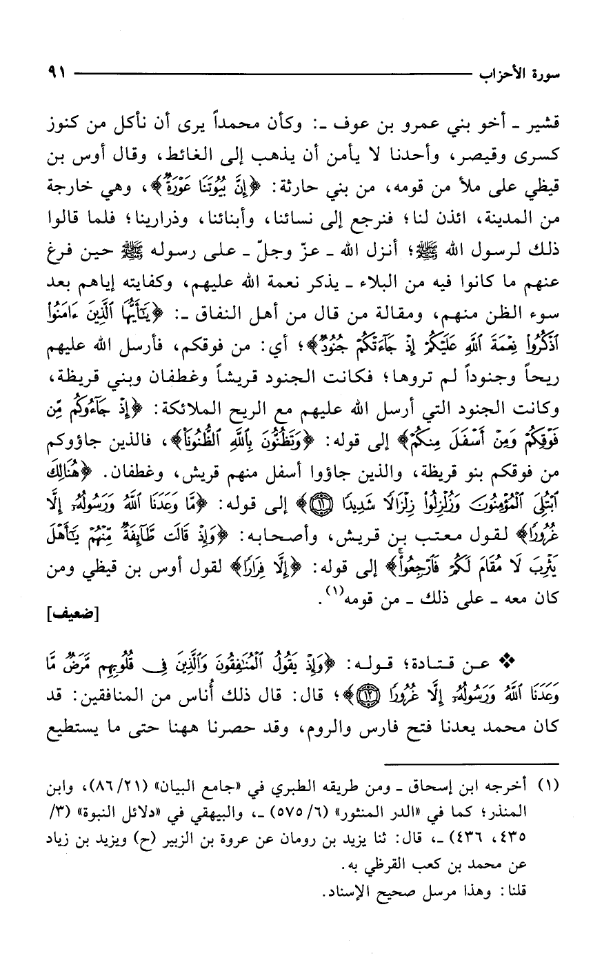 قشير -أخو بني عمرو بن عوف-: وكأن محمداً يرى أن نأكل من كنوز كسرى وقيصر، وأحدنا لا يأمن أن يذهب إلى الغائط، وقال أوس بن قيظي على ملأ من قومه، من بني حارثة: {إِنَّ بُيُوتَنَا عَوْرَةٌ}، وهي خارجة من المدينة، ائذن لنا؛ فنرجع إلى نسائنا، وأبنائنا، وذرارينا؛ فلما قالوا ذلك لرسول الله - صلى الله عليه وسلم -؛ أنزل الله -عزّ وجلّ- على رسوله - صلى الله عليه وسلم - حين فرغ عنهم ما كانوا فيه من البلاء -يذكر نعمة الله عليهم، وكفايته إياهم بعد سوء الظن منهم، ومقالة من قال من أهل النفاق-: {يَاأَيُّهَا الَّذِينَ آمَنُوا اذْكُرُوا نِعْمَةَ اللَّهِ عَلَيْكُمْ إِذْ جَاءَتْكُمْ جُنُودٌ}؛ أي: من فوقكم، فأرسل الله عليهم ريحاً وجنوداً لم تروها؛ فكانت الجنود قريشاً وغطفان وبني قريظة، وكانت الجنود التي أرسل الله عليهم مع الريح الملائكة: {إِذْ جَاءُوكُمْ مِنْ فَوْقِكُمْ وَمِنْ أَسْفَلَ مِنْكُمْ} إلى قوله: {وَتَظُنُّونَ بِاللَّهِ الظُّنُونَا}، فالذين جاؤوكم من فوقكم بنو قريظة، والذين جاؤوا أسفل منهم قريش، وغطفان. {هُنَالِكَ ابْتُلِيَ الْمُؤْمِنُونَ وَزُلْزِلُوا زِلْزَالًا شَدِيدًا (11)} إلى قوله: {مَا وَعَدَنَا اللَّهُ وَرَسُولُهُ إِلَّا غُرُورًا} لقول معتب بن قريش، وأصحابه: {وَإِذْ قَالَتْ طَائِفَةٌ مِنْهُمْ يَاأَهْلَ يَثْرِبَ لَا مُقَامَ لَكُمْ فَارْجِعُوا} إلى قوله: {إِلَّا فِرَارًا} لقول أوس بن قيظي ومن كان معه -على ذلك- من قومه (¬1). [ضعيف]