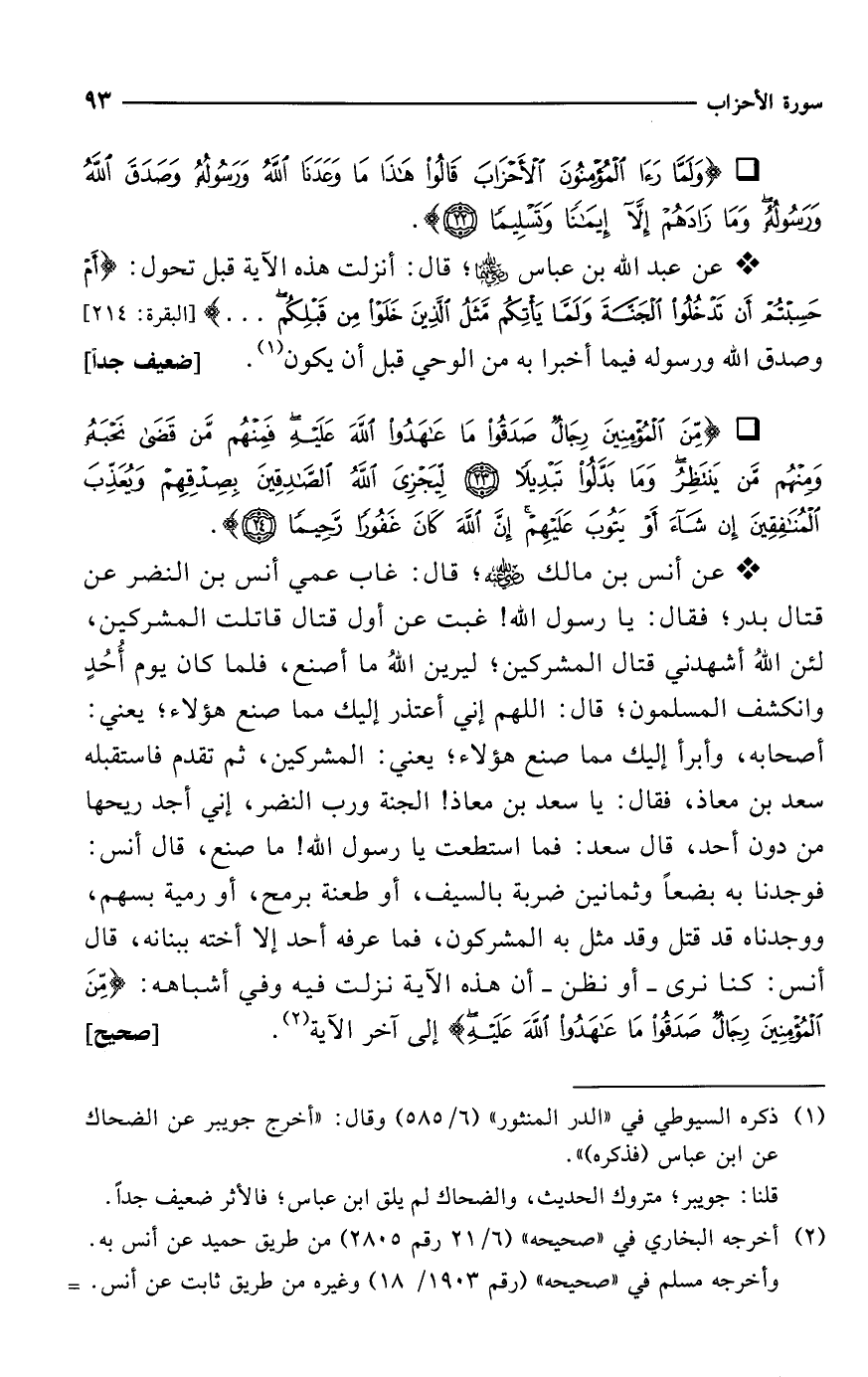 * عن أنس بن مالك -رضي الله عنه-؛ قال: غاب عمي أنس بن النضر عن قتال بدر؛ فقال: يا رسول الله! غبت عن أول قتال قاتلت المشركين، لئن اللهُ أشهدني قتال المشركين؛ ليرين اللهُ ما أصنع، فلما كان يوم أُحُدٍ وانكشف المسلمون؛ قال: اللهم إني أعتذر إليك مما صنع هؤلاء؛ يعني: أصحابه، وأبرأ إليك مما صنع هؤلاء؛ يعني: المشركين، ثم تقدم فاستقبله سعد بن معاذ، فقال: يا سعد بن معاذ! الجنة ورب النضر، إني أجد ريحها من دون أحد، قال سعد: فما استطعت يا رسول الله! ما صنع، قال أنس: فوجدنا به بضعاً وثمانين ضربة بالسيف، أو طعنة برمح، أو رمية بسهم، ووجدناه قد قتل وقد مثل به المشركون، فما عرفه أحد إلا أخته ببنانه، قال أنس: كنا نرى -أو نظن- أن هذه الآية نزلت فيه وفي أشباهه: {مِنَ الْمُؤْمِنِينَ رِجَالٌ صَدَقُوا مَا عَاهَدُوا اللَّهَ عَلَيْهِ} إلى آخر الآية (¬2). [صحيح]