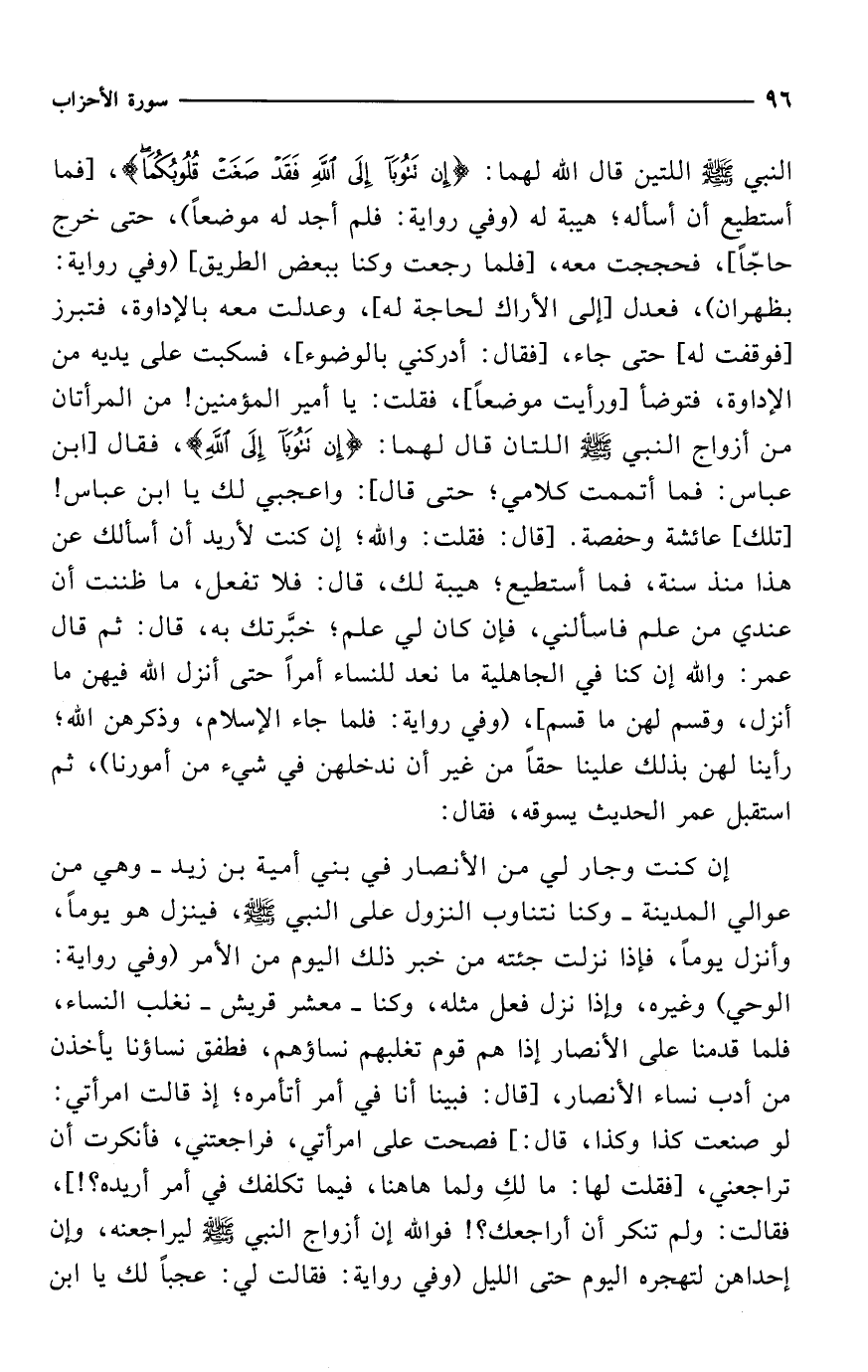 النبي - صلى الله عليه وسلم - اللتين قال الله لهما: {إِنْ تَتُوبَا إِلَى اللَّهِ فَقَدْ صَغَتْ قُلُوبُكُمَا}، [فما أستطيع أن أسأله؛ هيبة له (وفي رواية: فلم أجد له موضعاً)، حتى خرج حاجّاً] فحججت معه، [فلما رجعت وكنا ببعض الطريق] (وفي رواية: بظهران)، فعدل [إلى الأراك لحاجة له]، وعدلت معه بالإداوة، فتبرز [فوقفت له] حتى جاء، [فقال: أدركني بالوضوء]، فسكبت على يديه من الإداوة، فتوضأ [ورأيت موضعاً]، فقلت: يا أمير المؤمنين! من المرأتان من أزواج النبي - صلى الله عليه وسلم - اللتان قال لهما: {إِنْ تَتُوبَا إِلَى اللَّهِ}، فقال [ابن عباس: فما أتممت كلامي؛ حتى قال]: واعجبي لك يا ابن عباس! [تلك] عائشة وحفصة. [قال: فقلت: والله؛ إن كنت لأريد أن أسألك عن هذا منذ سنة، فما أستطيع؛ هيبة لك، قال: فلا تفعل، ما ظننت أن عندي من علم فاسألني، فإن كان لي علم؛ خبَّرتك به، قال: ثم قال عمر: والله إن كنا في الجاهلية ما نعد للنساء أمراً حتى أنزل الله فيهن ما أنزل، وقسم لهن ما قسم]، (وفي رواية: فلما جاء الإِسلام، وذكرهن الله؛ رأينا لهن بذلك علينا حقاً من غير أن ندخلهن في شيء من أمورنا)، ثم استقبل عمر الحديث يسوقه، فقال: