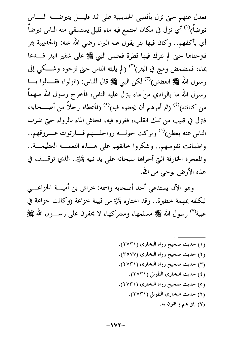 فعدل عنهم حتى نزل بأقصى الحديبية على ثمد قليل يتبرضه الناس تبرضًا) (¬1) أي نزل في مكان اجتمع فيه ماء قليل يستسقي منه الناس تبرضًا أي بأكفهم .. وكان فيها بئر يقول عنه البراء رضي الله عنه: (الحديبية بئر فترحناها حتى لم نترك فيها قطرة فجلس النبي - صلى الله عليه وسلم - على شفير البئر فدعا بماء، فمضمض ومج في البئر) (¬2) (لم يلبثه الناس حتى نزحوه وشكي إلى رسول الله - صلى الله عليه وسلم - العطش) (¬3) لكن النبي - صلى الله عليه وسلم - قال للناس: (انزلوا، فقالوا يا رسول الله ما بالوادي من ماء ينزل عليه الناس، فأخرج رسول الله سهمًا من كنانته) (¬4) (ثم أمرهم أن يجعلوه فيه) (¬5) (فأعطاه رجلًا من أصحابه، فنزل في قليب من تلك القلب، فغرزه فيه، فجاش الماء بالرواء حتى ضرب الناس عنه بعطن) (¬6) وبركت حوله رواحلهم فارتوت عروقهم .. واطمأنت نفوسهم .. وشكروا خالقهم على هذه النعمة العظيمة .. والمعجزة الخارقة التي أجراها سبحانه على يد نبيه - صلى الله عليه وسلم - .. الذي توقف في هذه الأرض بوحي من الله.