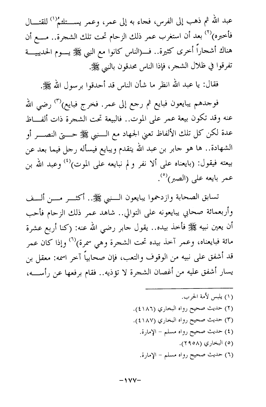 عبد الله ثم ذهب إلى الفرس، فجاء به إلى عمر، وعمر يستلئمُ (¬1) للقتال فأخبره) (¬2) بعد أن استغرب عمر ذلك الزحام تحت تلك الشجرة .. مع أن هناك أشجارًا أخرى كثيرة .. فـ (الناس كانوا مع النبي - صلى الله عليه وسلم - يوم الحديبية تفرقوا في ظلال الشجر، فإذا الناس محدقون بالنبي - صلى الله عليه وسلم -.