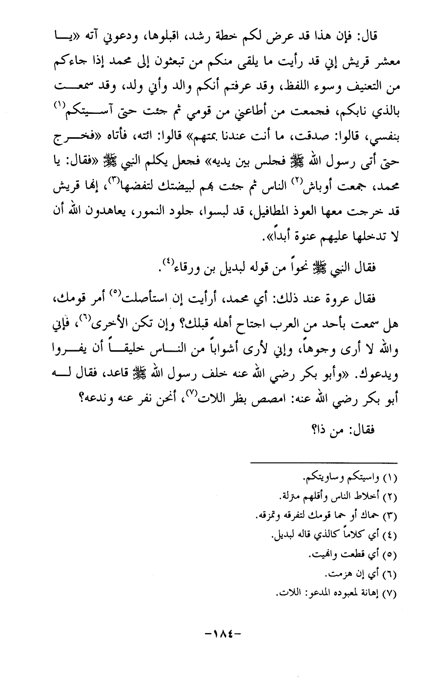 فقال عروة عند ذلك: أي محمد، أرأيت إن استأصلت (¬5) أمر قومك، هل سمعت بأحد من العرب اجتاح أهله قبلك؟ وإن تكن الأخرى (¬6)، فإني والله لا أرى وجوهًا، وإني لأرى أشوابًا من الناس خليقًا أن يفروا ويدعوك. "وأبو بكر رضي الله عنه خلف رسول الله - صلى الله عليه وسلم - قاعد، فقال له أبو بكر رضي الله عنه: امصص بظر اللات (¬7)، أنحن نفر عنه وندعه؟
