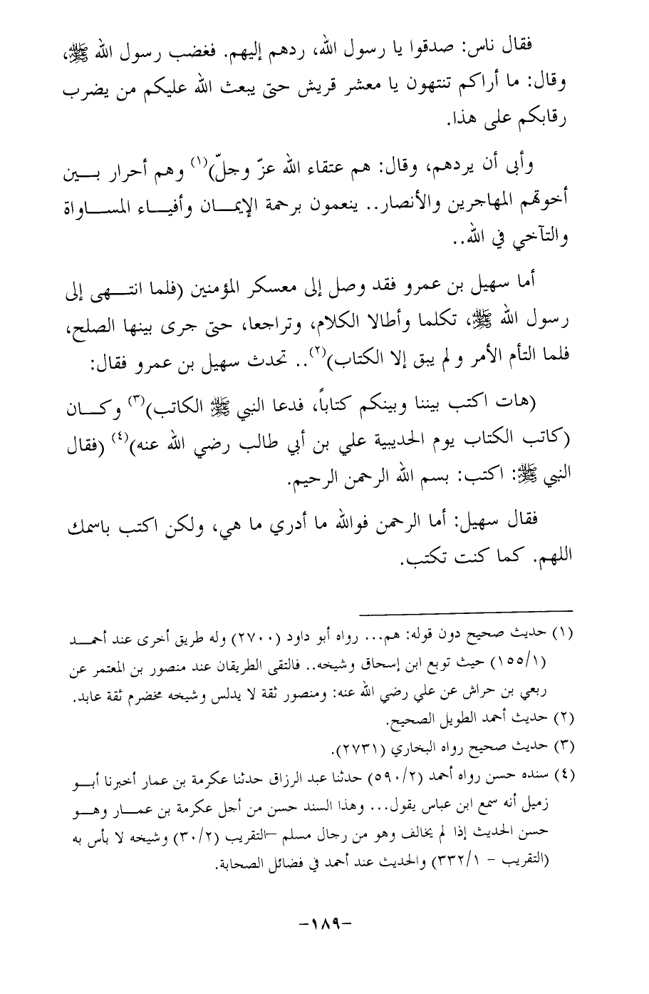 أما سهيل بن عمرو فقد وصل إلى معسكر المؤمنين (فلما انتهى إلى رسول الله - صلى الله عليه وسلم -، تكلما وأطالا الكلام، وتراجعا، حتى جرى بينها الصلح، فلما التأم الأمر ولم يبق إلا الكتاب) (¬2) .. تحدث سهيل بن عمرو فقال: