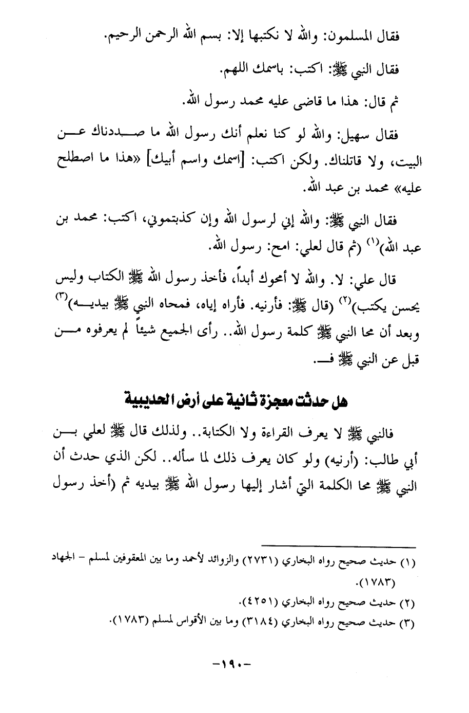 فالنبي - صلى الله عليه وسلم - لا يعرف القراءة ولا الكتابة .. ولذلك قال - صلى الله عليه وسلم - لعلي بن أبي طالب: (أرنيه) ولو كان يعرف ذلك لما سأله .. لكن الذي حدث أن النبي - صلى الله عليه وسلم - محا الكلمة التي أشار إليها رسول الله - صلى الله عليه وسلم - بيديه ثم (أخذ رسول