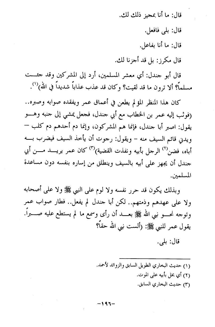 وبذلك يكون قد حرر نفسه ولا لوم على النبي - صلى الله عليه وسلم - ولا على أصحابه ولا على عهدهم وذمتهم .. لكن أبا جندل لم يفعل .. فطار صواب عمر وتوجه نحو نبي الله - صلى الله عليه وسلم - بعد أن رأى وسمع ما لم يستطع عليه صبرًا. يقول عمر للنبي - صلى الله عليه وسلم -: (ألست نبي الله حقًا؟