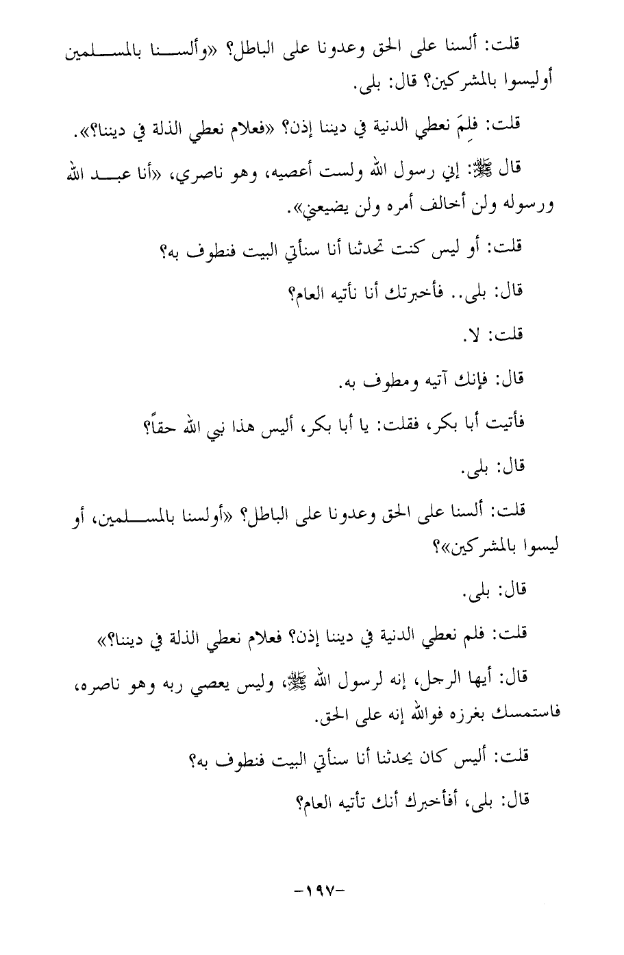 قلت: ألسنا على الحق وعدونا على الباطل؟ "أولسنا بالمسلمين، أوليسوا بالمشركين"؟