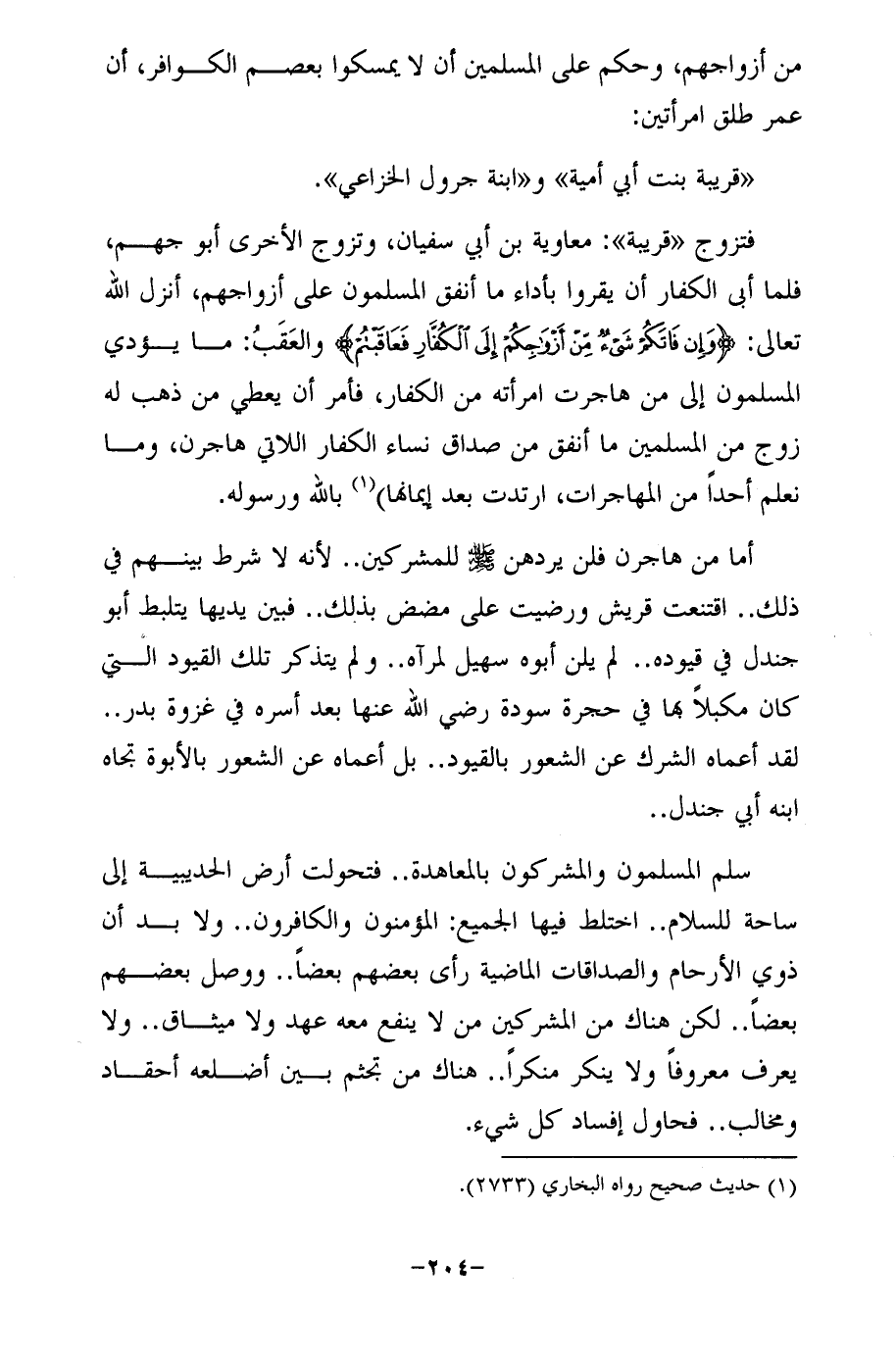 أما من هاجرن فلن يردهن - صلى الله عليه وسلم - للمشركين .. لأنه لا شرط بينهم في ذلك .. اقتنعت قريش ورضيت على مضض بذلك .. فبين يديها يتلبط أبو جندل في قيوده .. لم يلن أبوه سهيل لمرآه .. ولم يتذكر تلك القيود التي كان مكبلًا بها في حجرة سودة رضي الله عنها بعد أسره في غزوة بدر .. لقد أعماه الشرك عن الشعور بالقيود .. بل أعماه عن الشعور بالأبوة تجاه ابنه أبي جندل ..